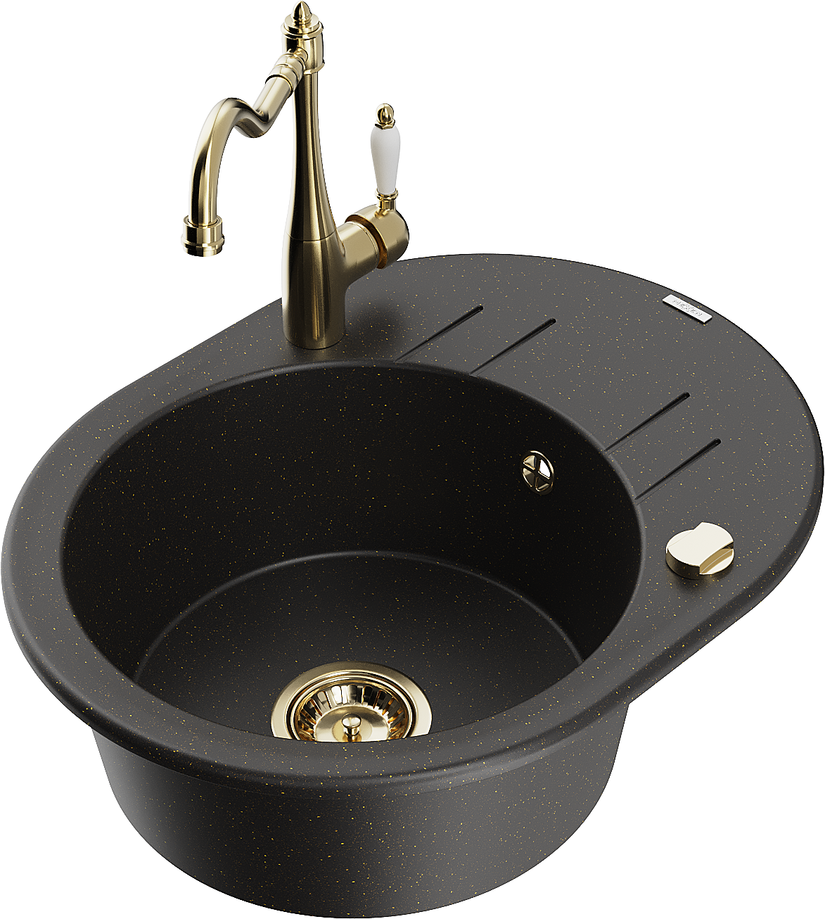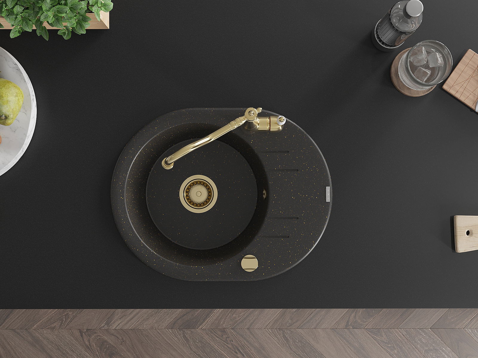 Mexen Kevin chiuvetă de granit cu o singură cuvă cu scurgător și robinet de bucătărie Carla, negru/auriu metalizat