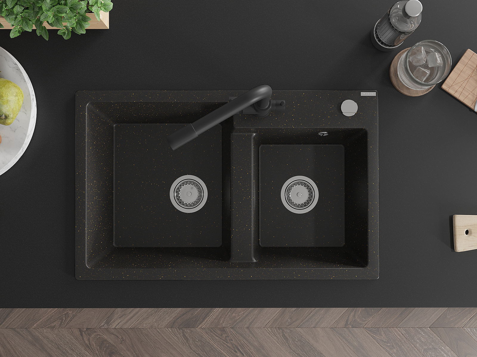 Mexen Tomas chiuvetă de bucătărie din granit cu 2 compartimente și baterie Duero, negru/auriu metalizat - 6516-75-671600-70