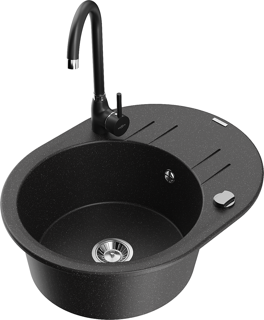 Mexen Kevin chiuvetă granitică cu 1 compartiment cu picurător și baterie de bucătărie Telma, negru/argintiu metalic