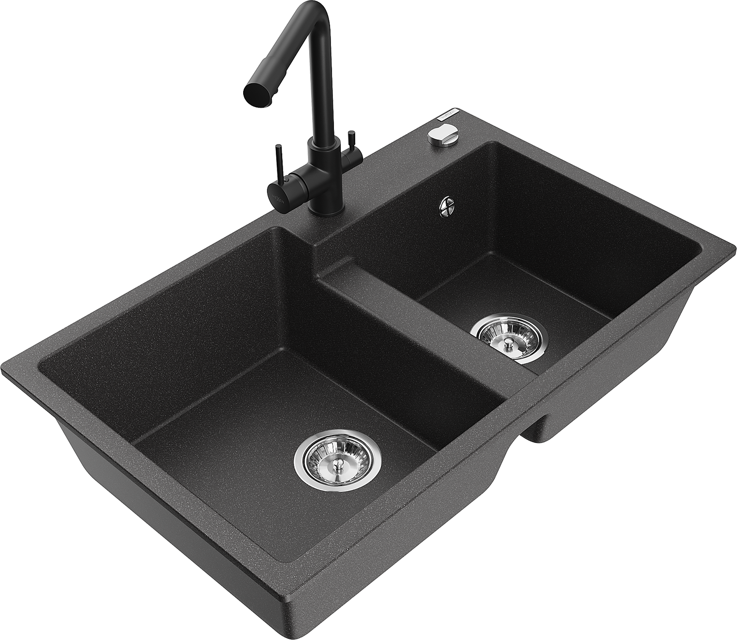 Mexen Tomas chiuvetă de bucătărie din granit cu 2 compartimente și baterie Duero, negru punctat - 6516-76-671600-70