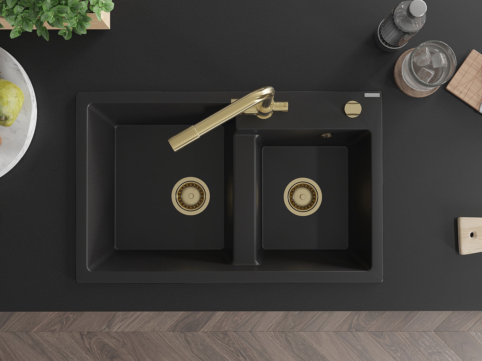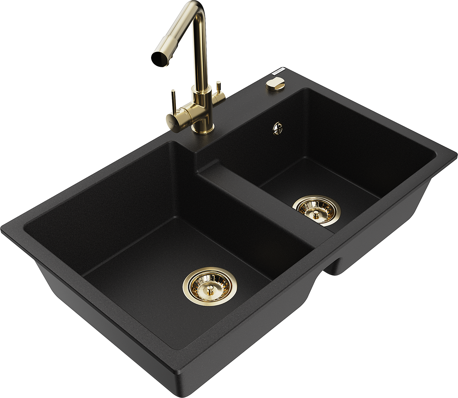 Mexen Tomas chiuvetă din granit cu 2 compartimente și baterie de bucătărie Duero, negru - 6516-77-671600-50