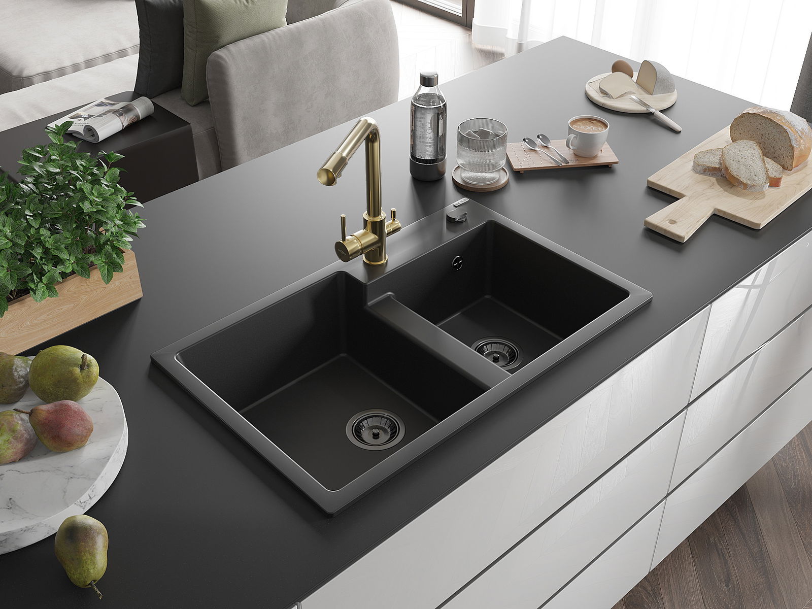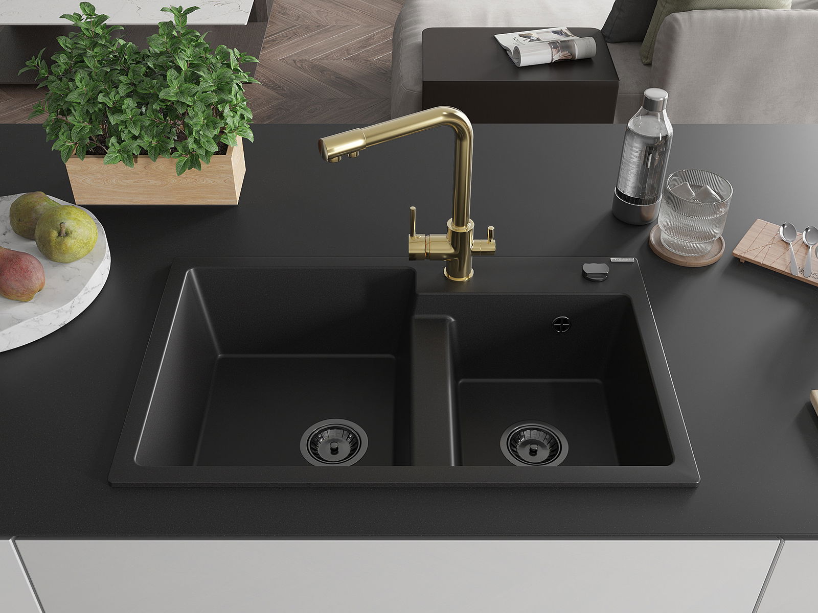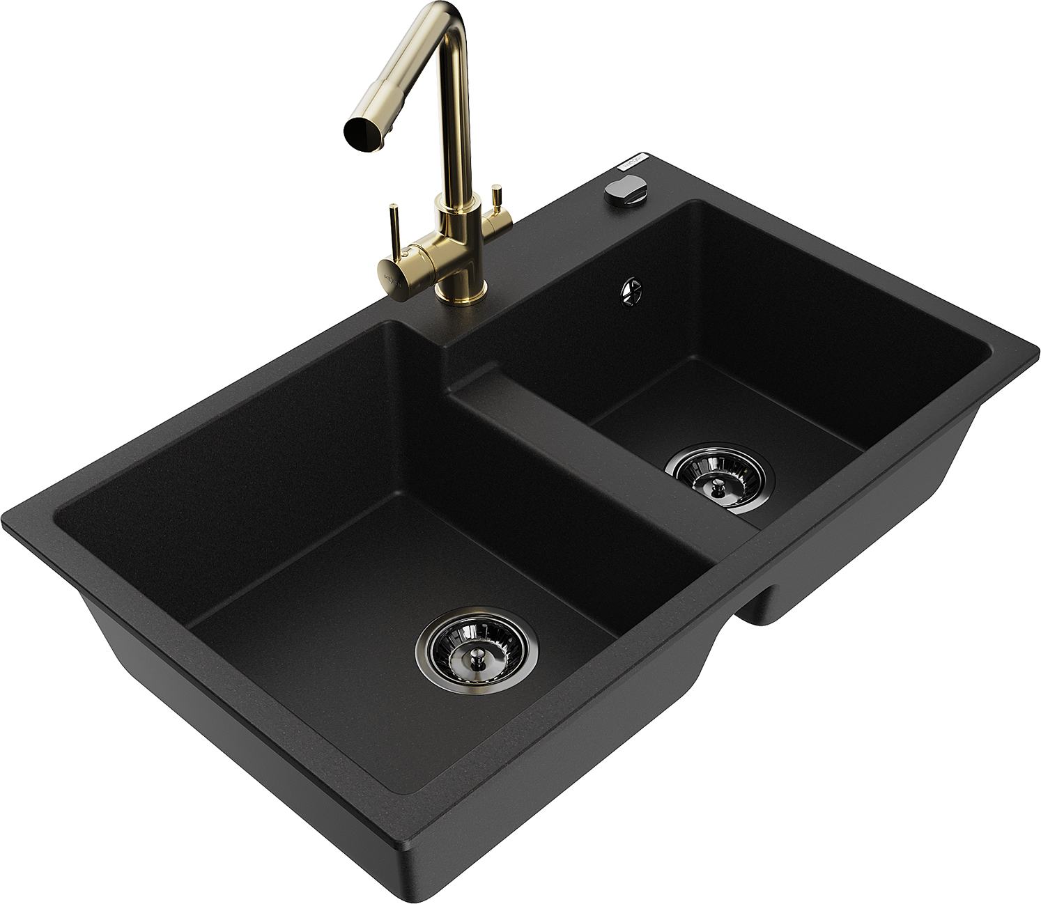 Mexen Tomas chiuvetă de granit cu 2 cuve cu baterie de bucătărie Duero, negru - 6516-77-671600-50-B