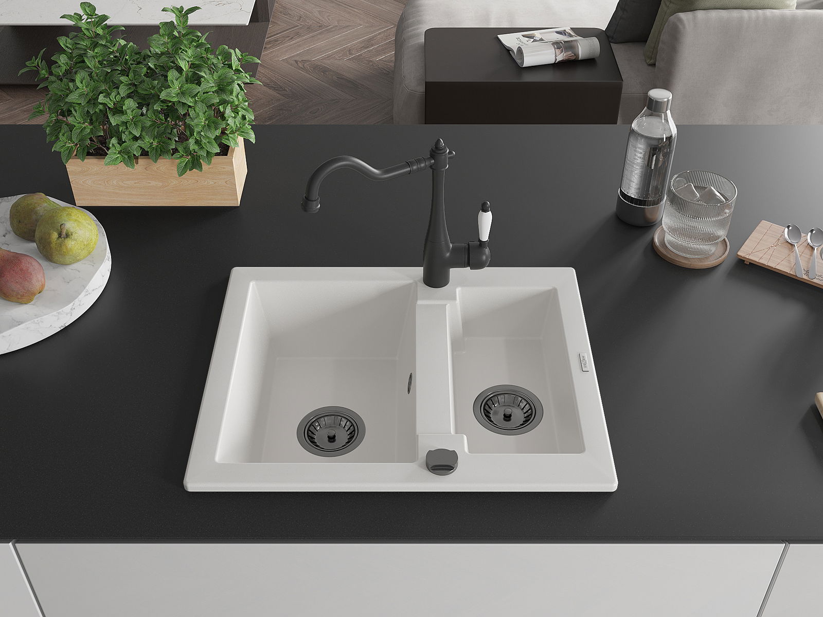 Mexen Carlos chiuvetă din granit cu 1,5 compartimente și baterie de bucătărie Carla, alb - 6518-20-670700-70