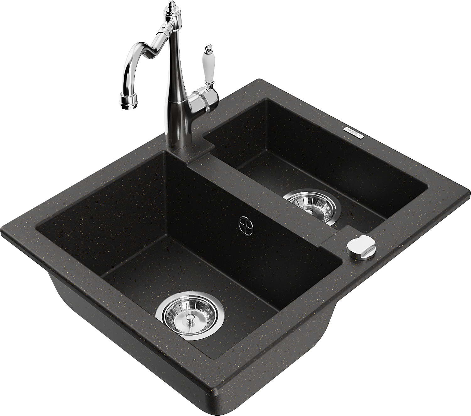 Mexen Carlos chiuvetă de granit 1,5 cuve cu baterie de bucătărie Carla, negru/auriu metalizat - 6518-75-670700-00