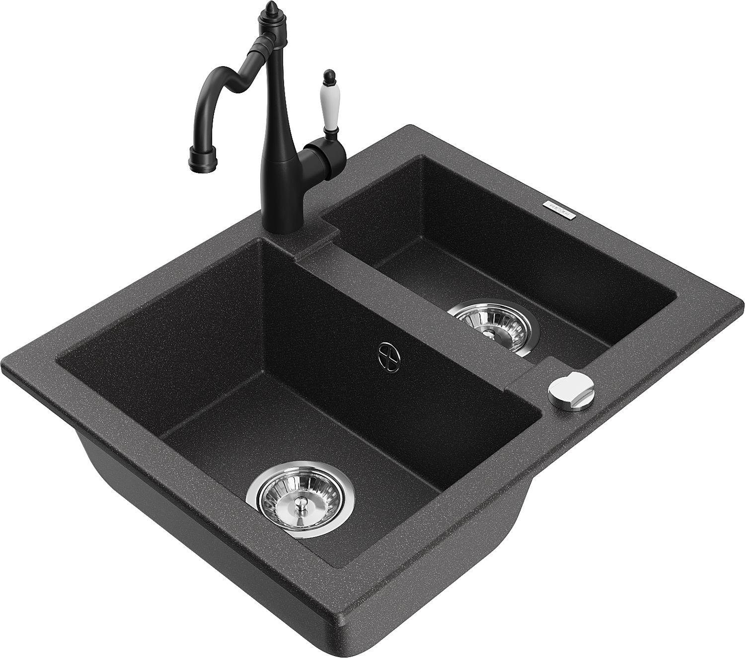 Mexen Carlos chiuvetă din granit, cu 1,5 cuve și baterie bucătărie Carla, negru stropit - 6518-76-670700-70