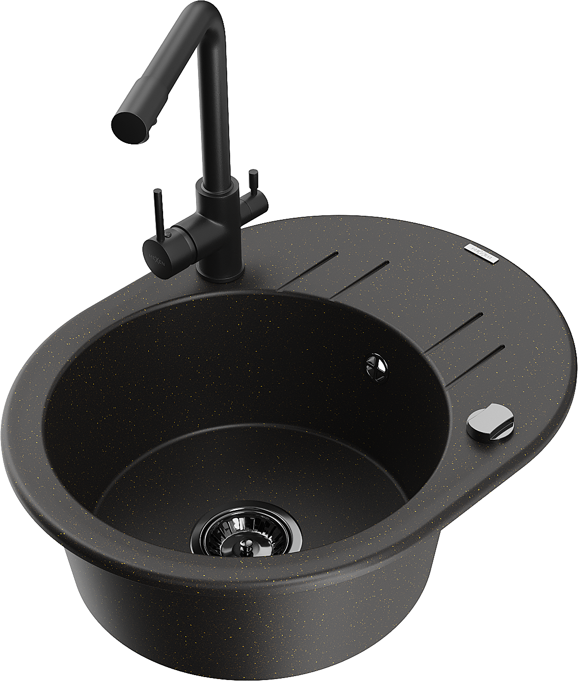 Mexen Kevin chiuvetă din granit cu o cuvă, cu picurător și robinet de bucătărie Duero, negru/auriu metalic