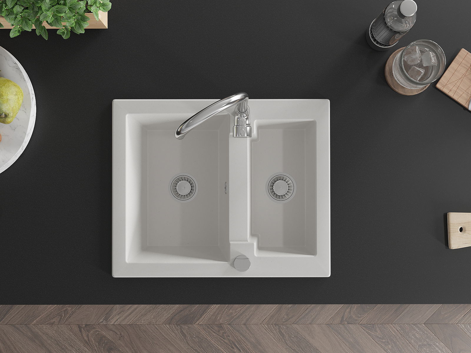 Mexen Carlos chiuvetă de granit cu 1,5 compartimente și baterie de bucătărie Telma, alb - 6518-20-670200-00