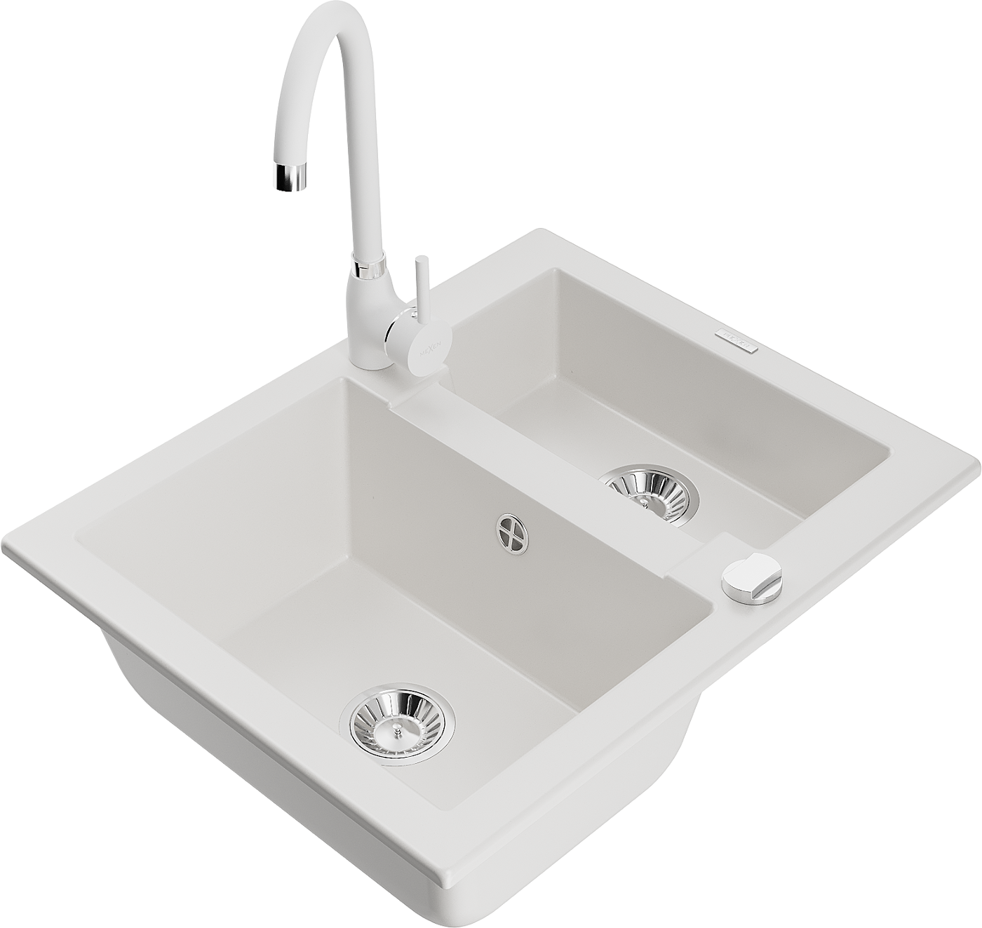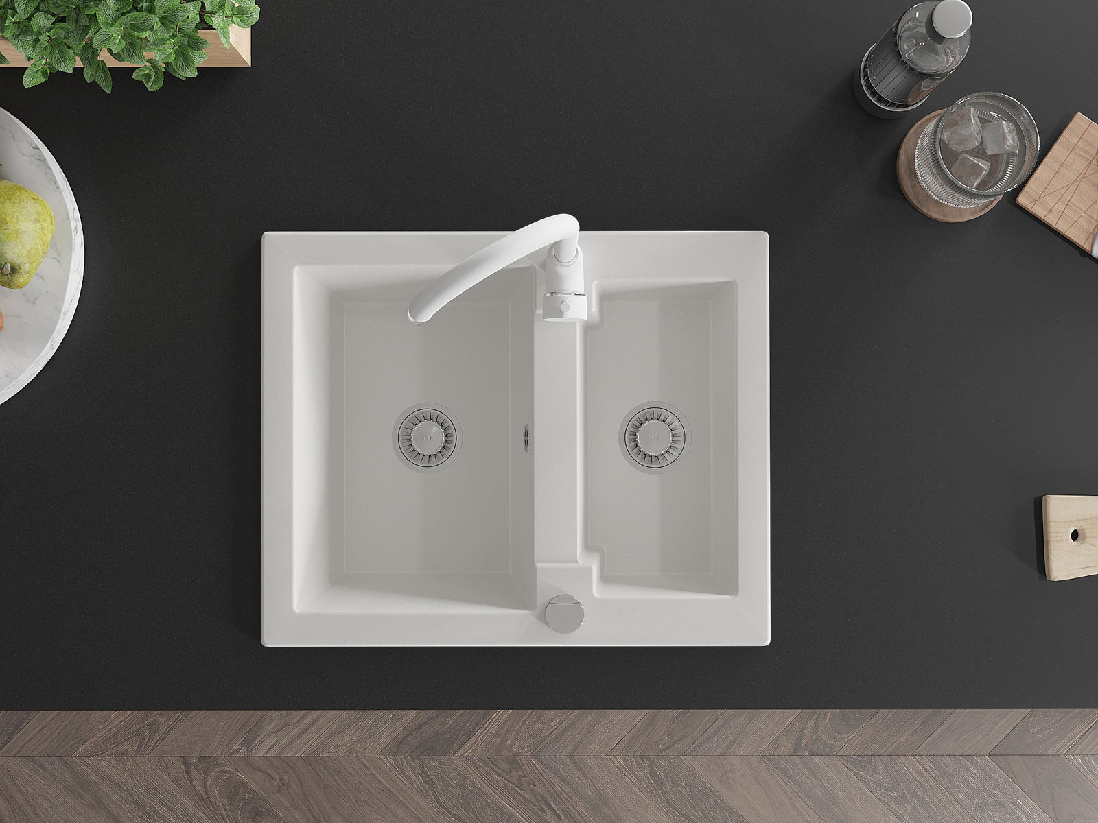 Mexen Carlos chiuvetă de granit 1,5 compartimente cu baterie de bucătărie Telma, alb - 6518-20-670200-20