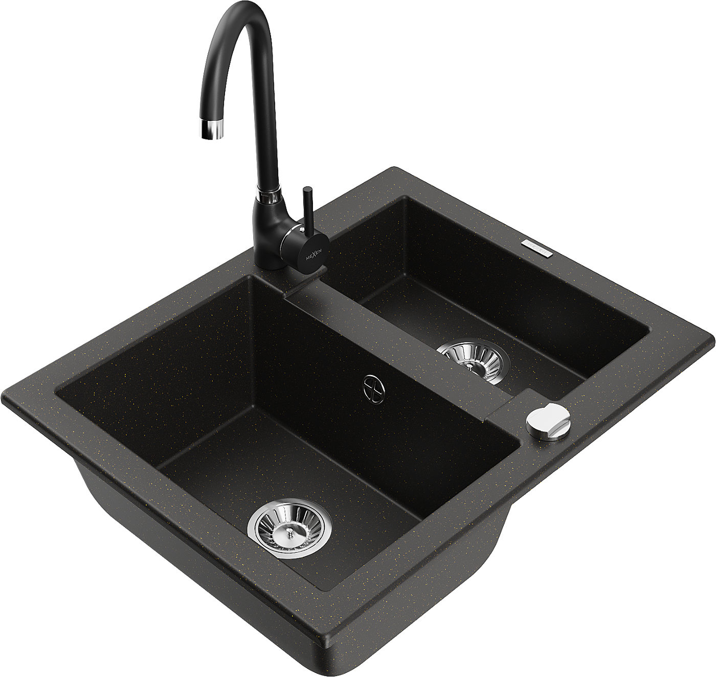Mexen Carlos chiuvetă din granit, 1,5 compartimente cu baterie de bucătărie Telma, negru/auriu metalic - 6518-75-670200-70