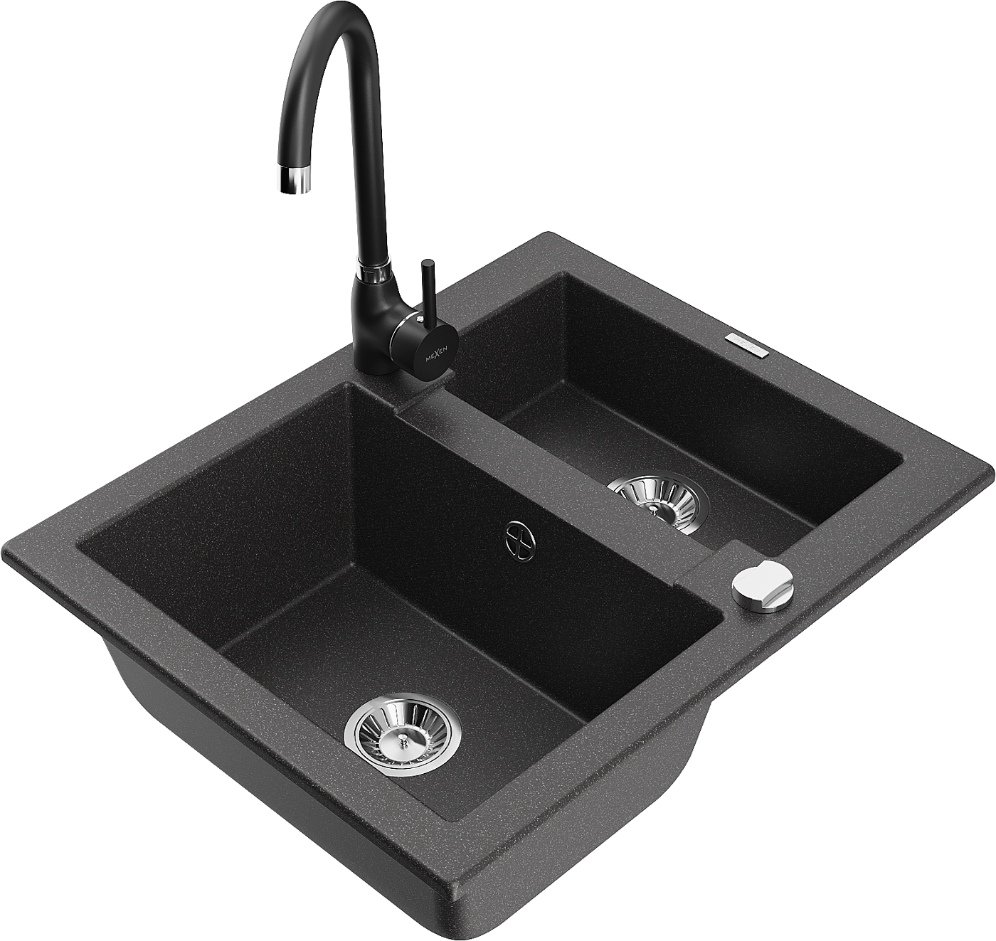 Mexen Carlos chiuvetă de granit cu 1,5 cuve cu baterie de bucătărie Telma, negru pătat - 6518-76-670200-70