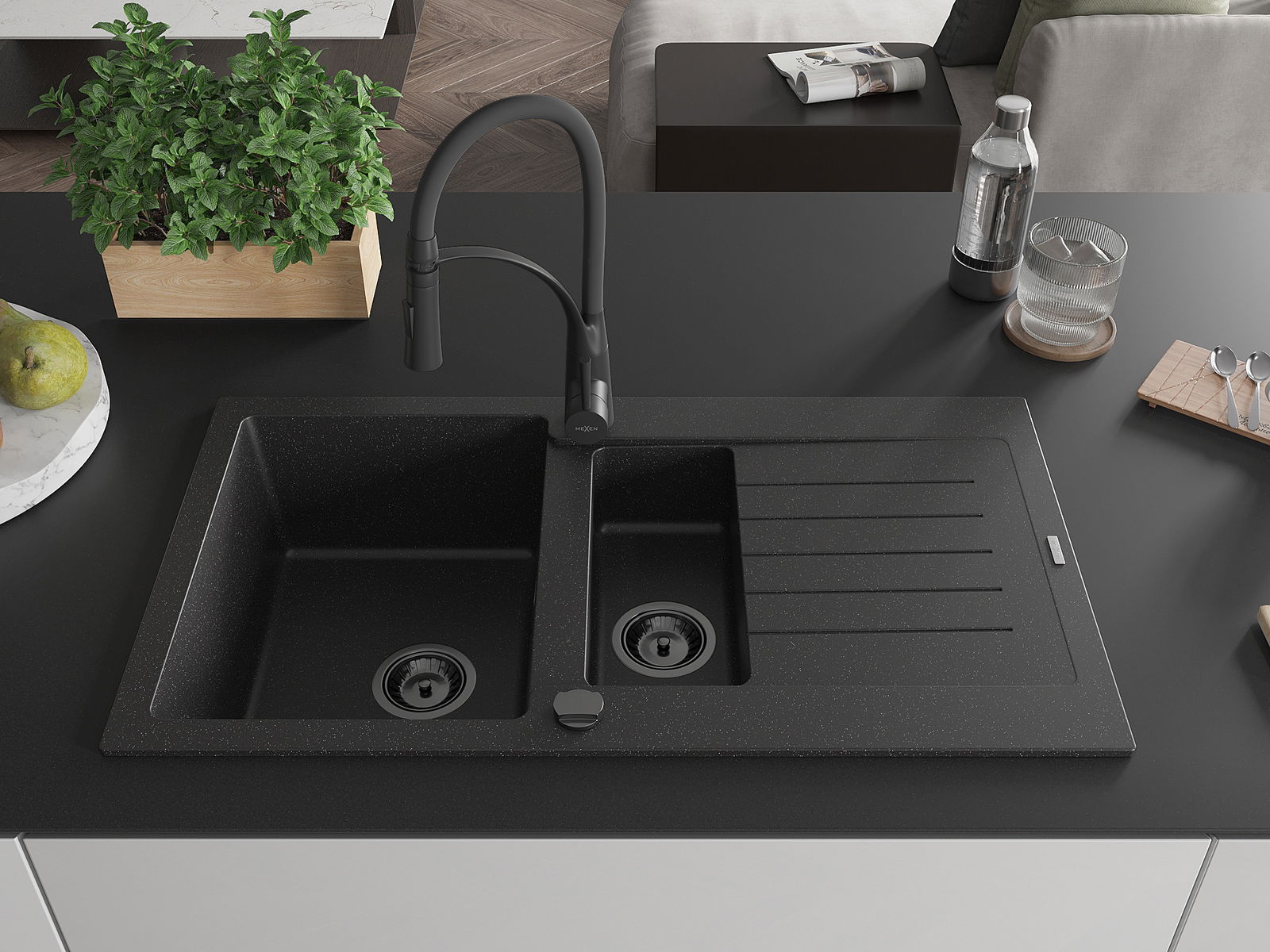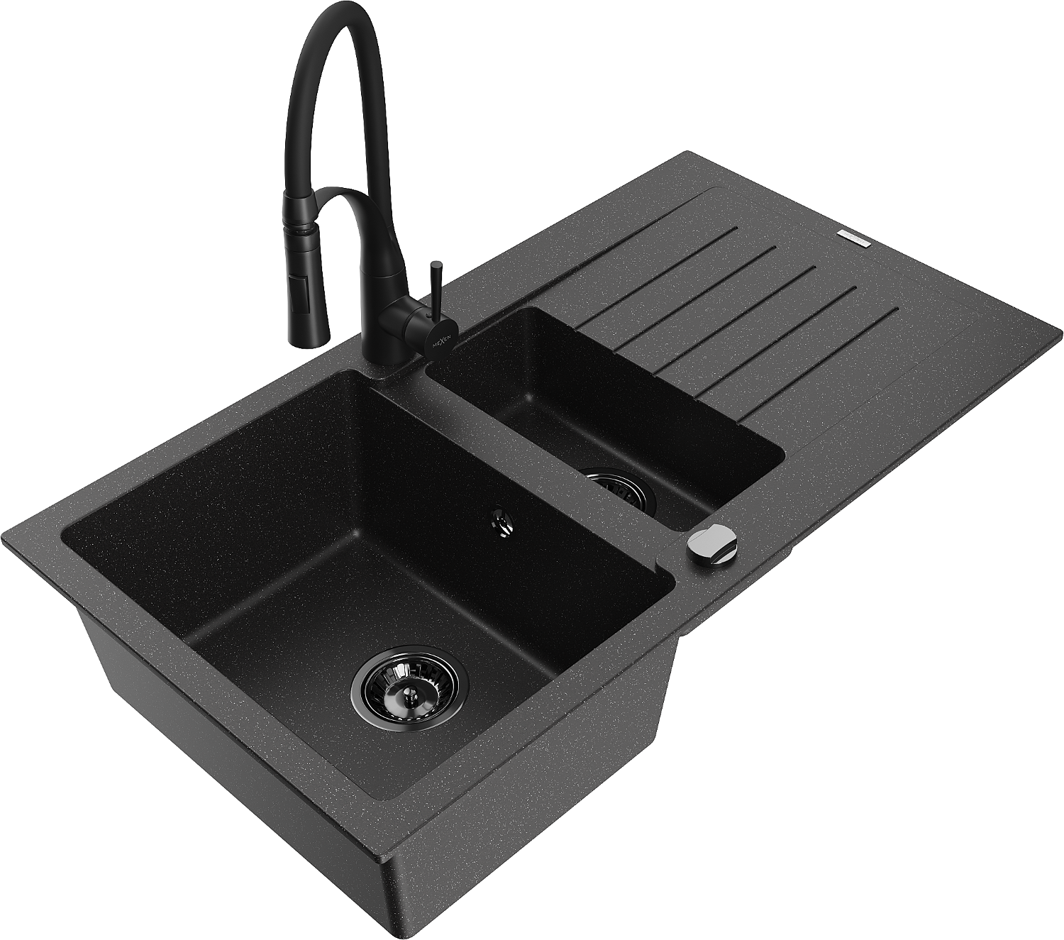 Mexen Matias chiuvetă de granit cu 1,5 cuve cu scurgător și baterie de bucătărie Aster, negru/argintiu - 6502-73-73450-70-B