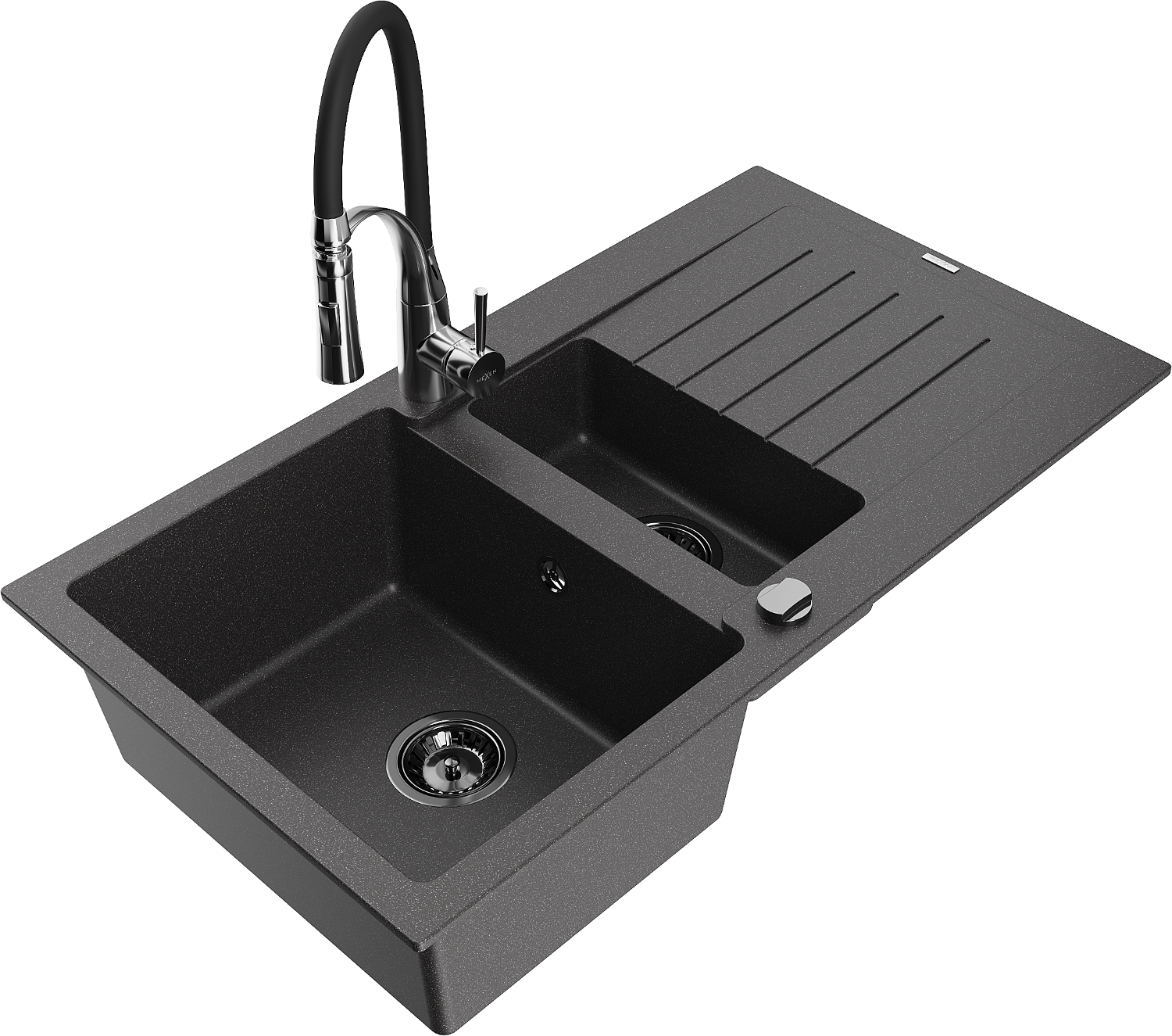 Mexen Matias chiuvetă granit 1,5 compartimente cu picurător și baterie de bucătărie Aster, negru cu pete - 6502-76-73450-07-B