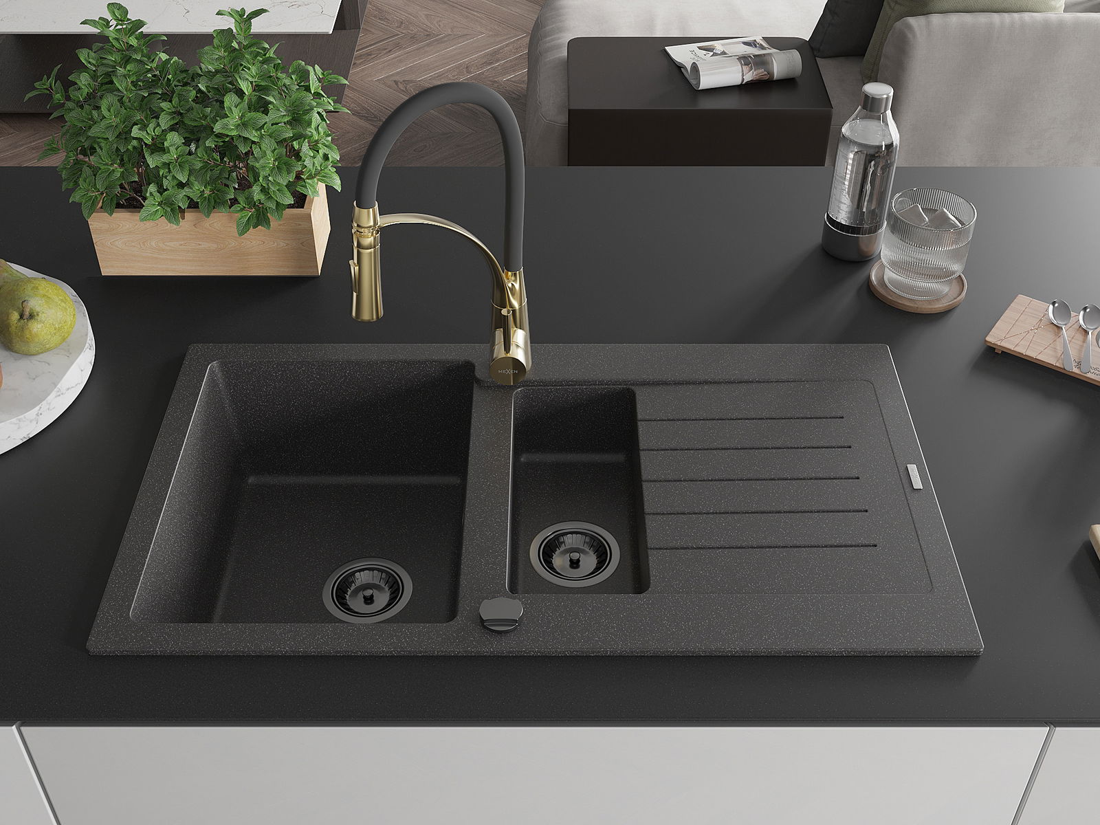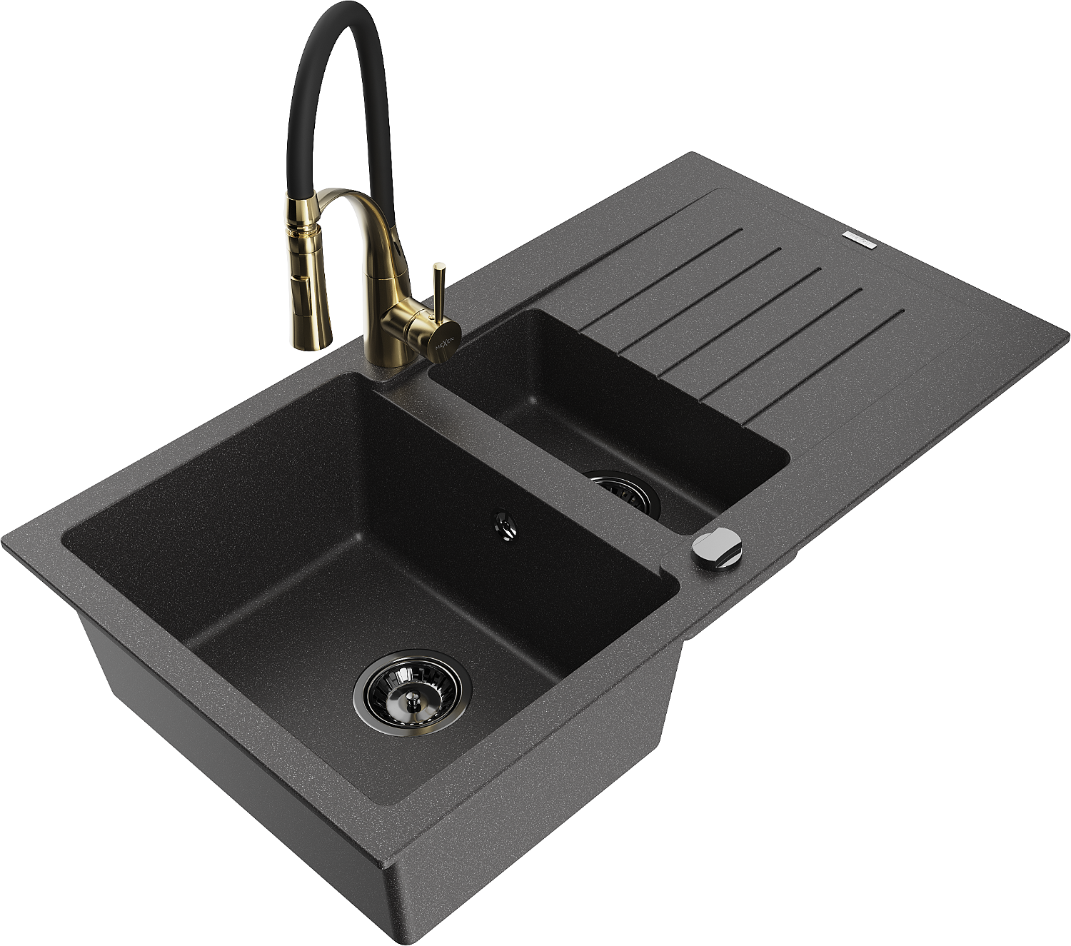 Mexen Matias chiuvetă din granit cu 1,5 camere, cu scurgător și baterie de bucătărie Aster, negru cu pete