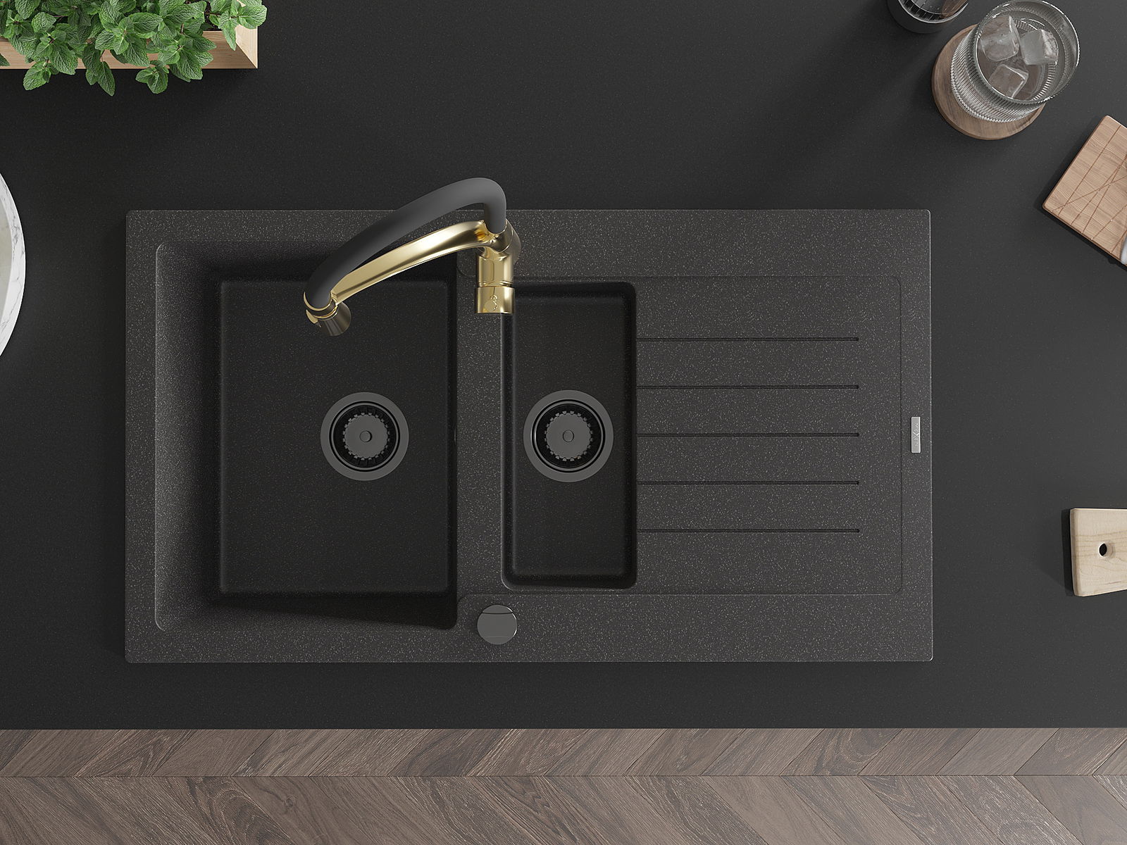Chiuveta are 2 orificii frezate de 35 mm în diametru, care pot fi perforate manual. Acestea pot fi utilizate, printre altele, pentru instalarea unui dozator de detergent, care va elimina prezența sticlelor de plastic din bucătărie și va oferi un finisaj elegant.