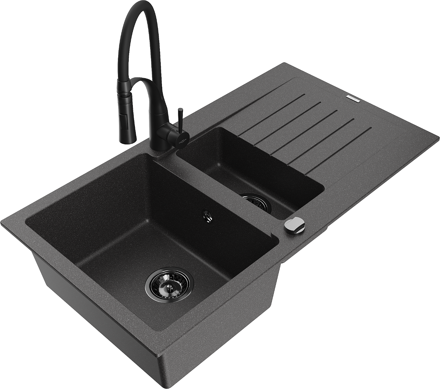 Mexen Matias chiuvetă granit 1,5 boluri cu scurgător și baterie de bucătărie Aster, negru cu picățele - 6502-76-73450-70-B