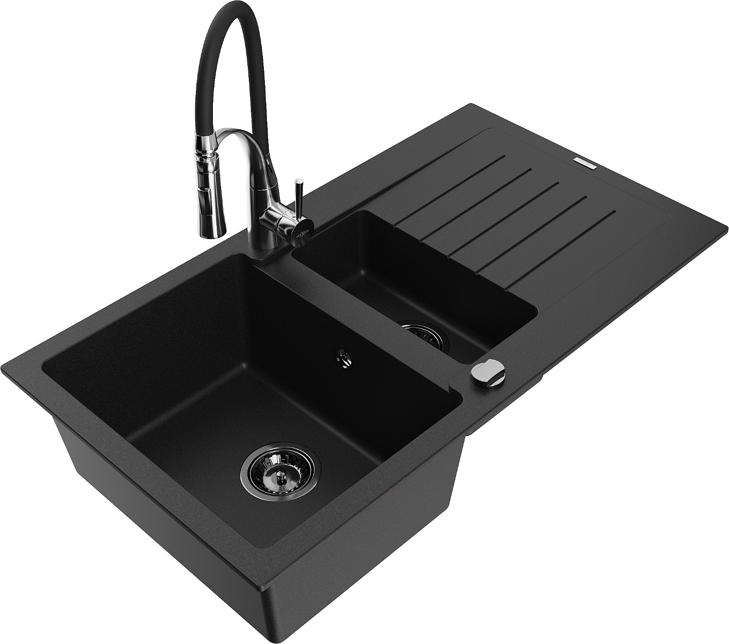Mexen Matias chiuvetă de granit cu 1,5 compartimente, cu scurgător și baterie de bucătărie Aster, neagră