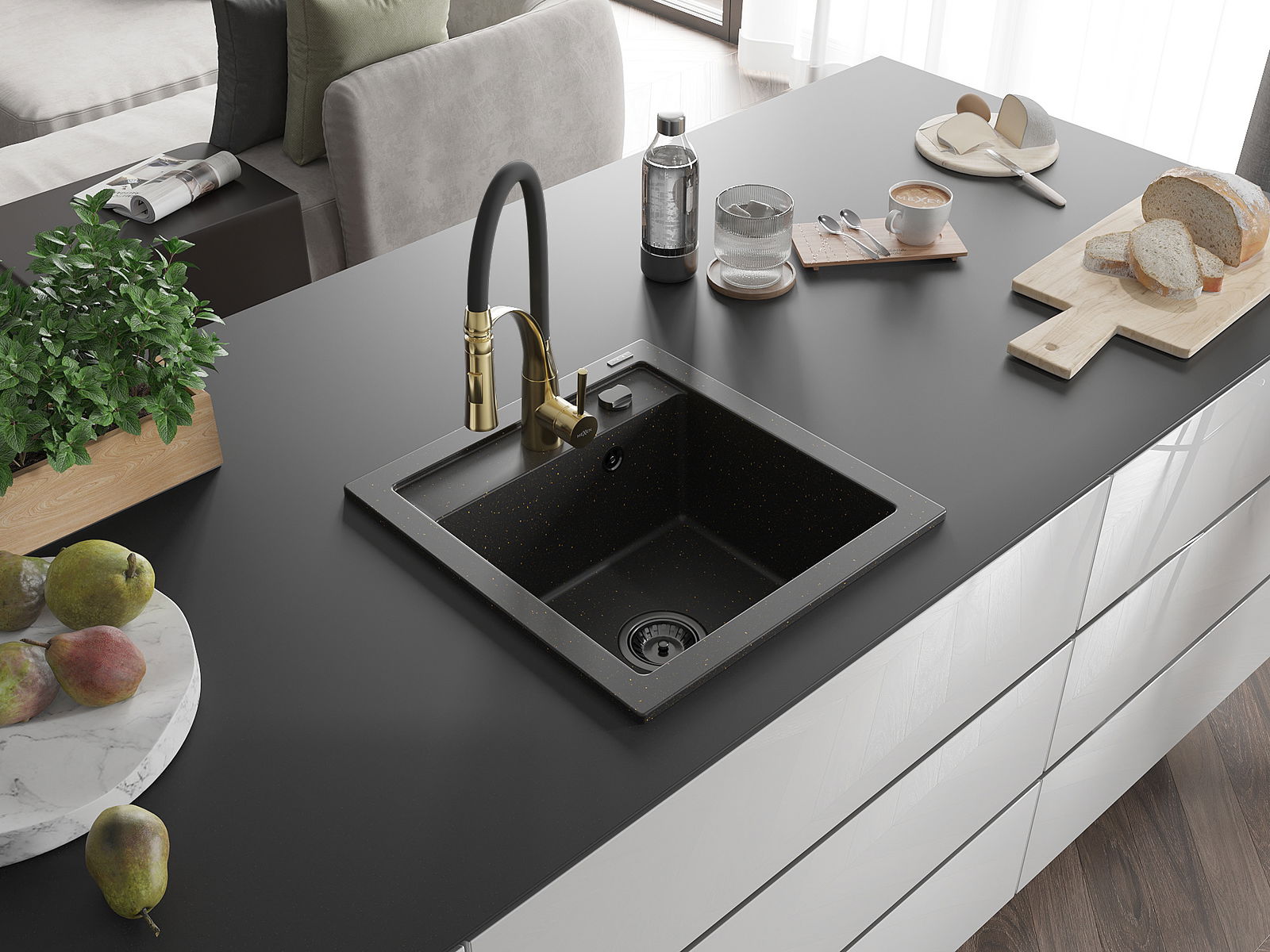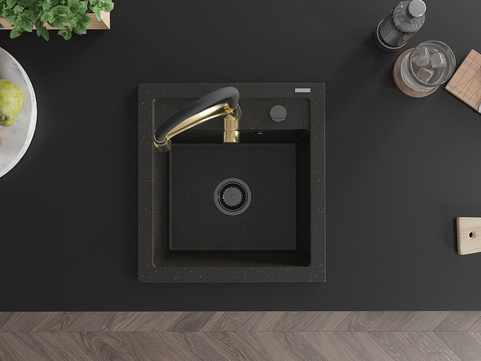 Mexen Vito chiuvetă de granit cu 1 compartiment și baterie de bucătărie Aster, negru/or metalic auriu- 6503-75-73450-57-B