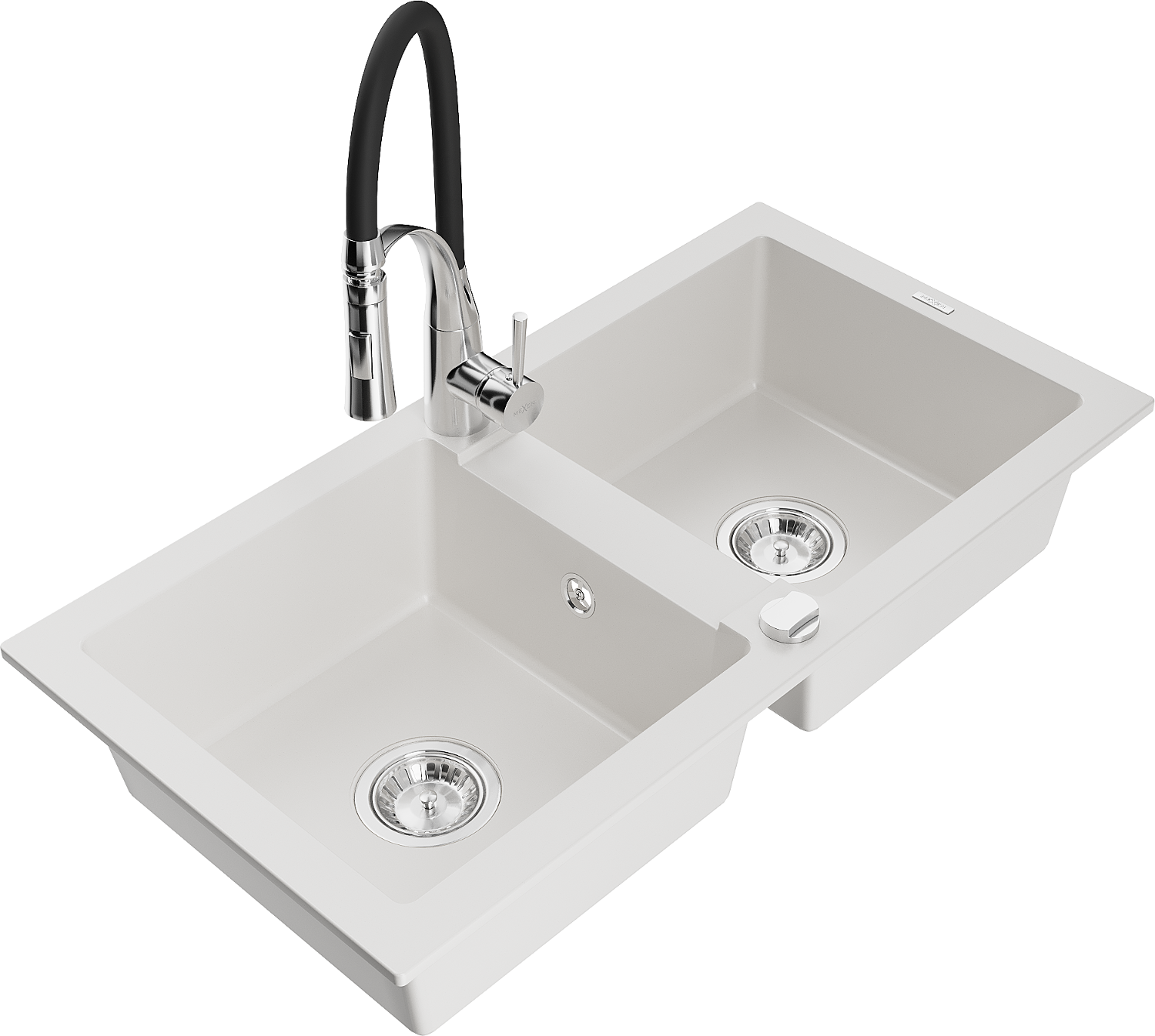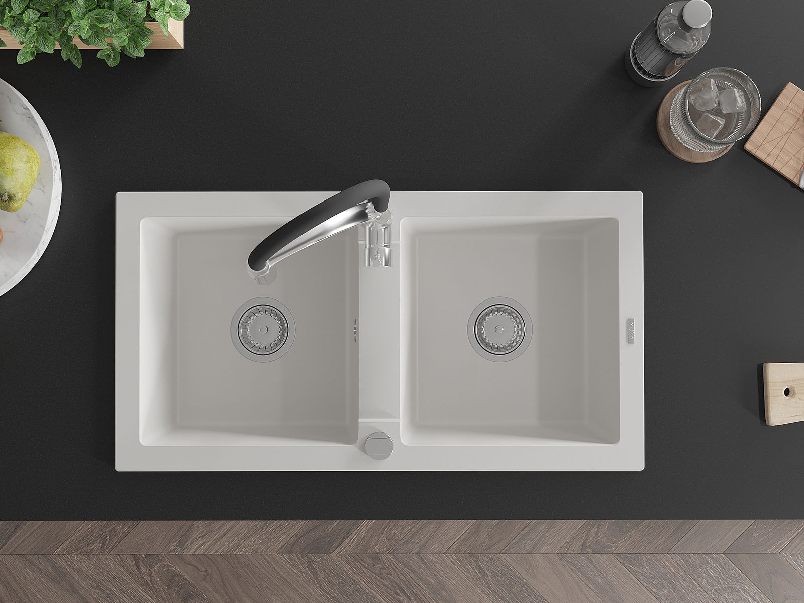 Mexen Mario chiuvetă de bucătărie din granit, cu 2 compartimente și baterie de bucătărie Aster, alb - 6504-20-73450-07