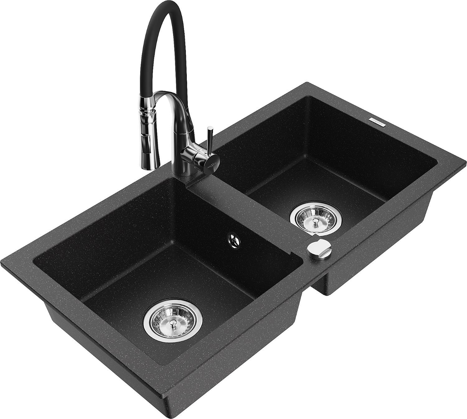 Mexen Mario chiuvetă de bucătărie din granit cu 2 cuve și cu baterie Aster, negru/argintiu metalizat - 6504-73-73450-07