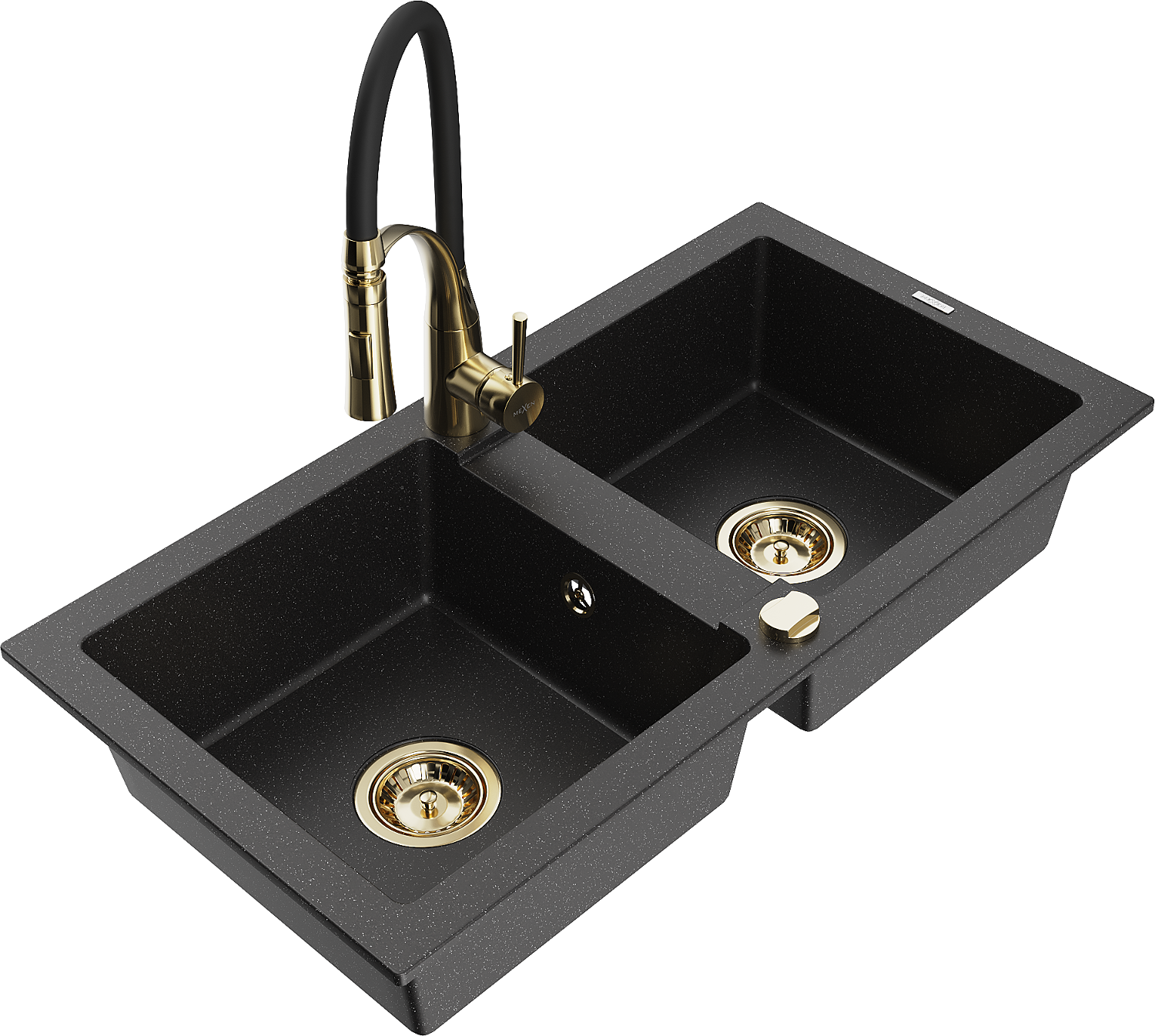 Mexen Mario chiuvetă de granit cu 2 compartimente cu baterie de bucătărie Aster, negru/argintiu metalic - 6504-73-73450-57-G