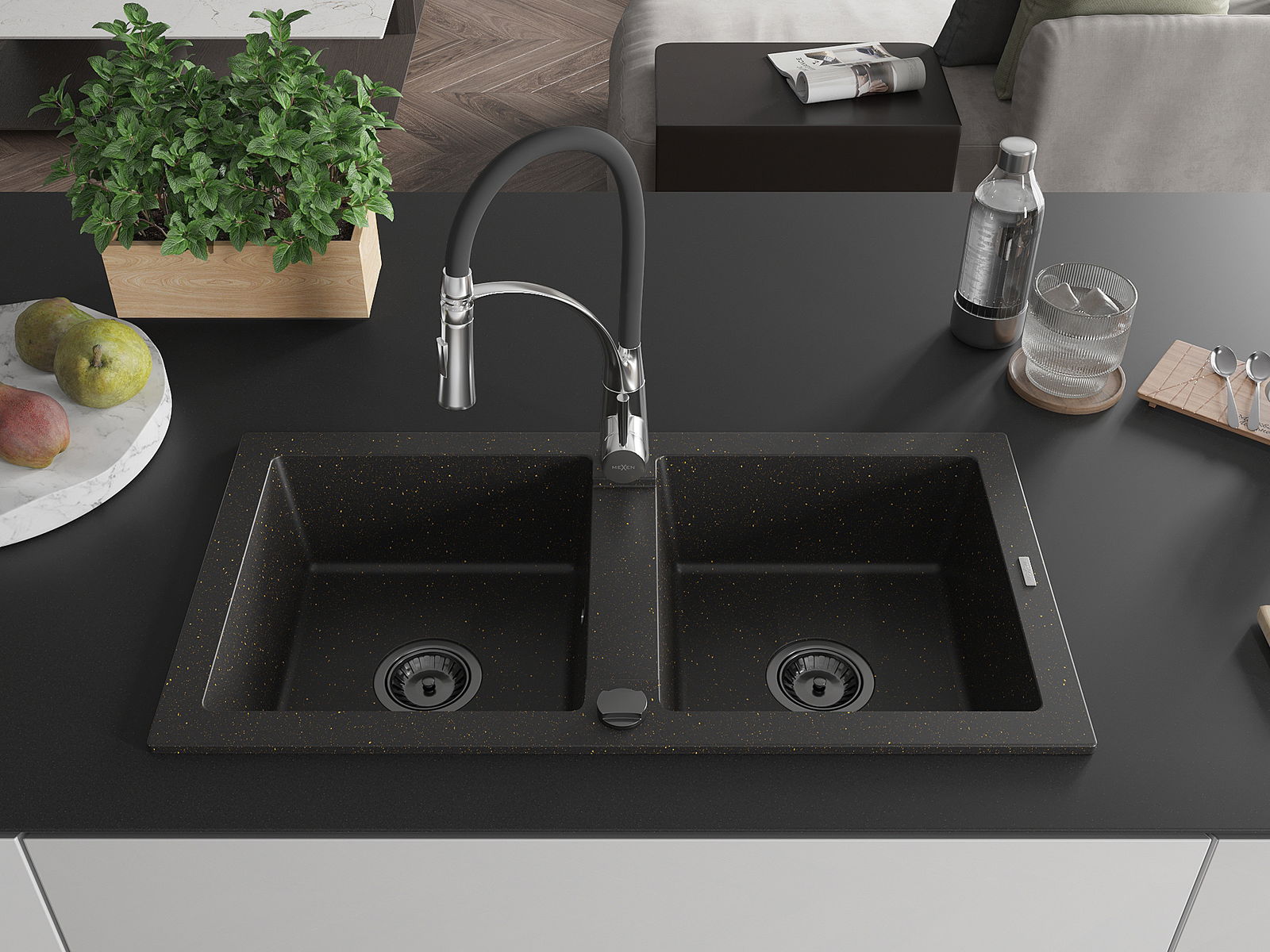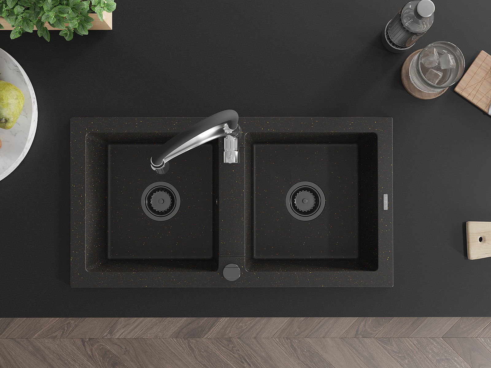 Mexen Mario chiuvetă de granit cu 2 camere cu baterie de bucătărie Aster, negru/auriu metalic - 6504-75-73450-07-B