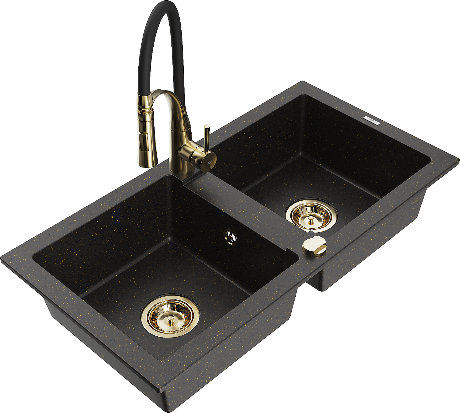 Mexen Mario chiuvetă de granit cu 2 compartimente cu baterie de bucătărie Aster, negru/auriu metalizat - 6504-75-73450-57-G