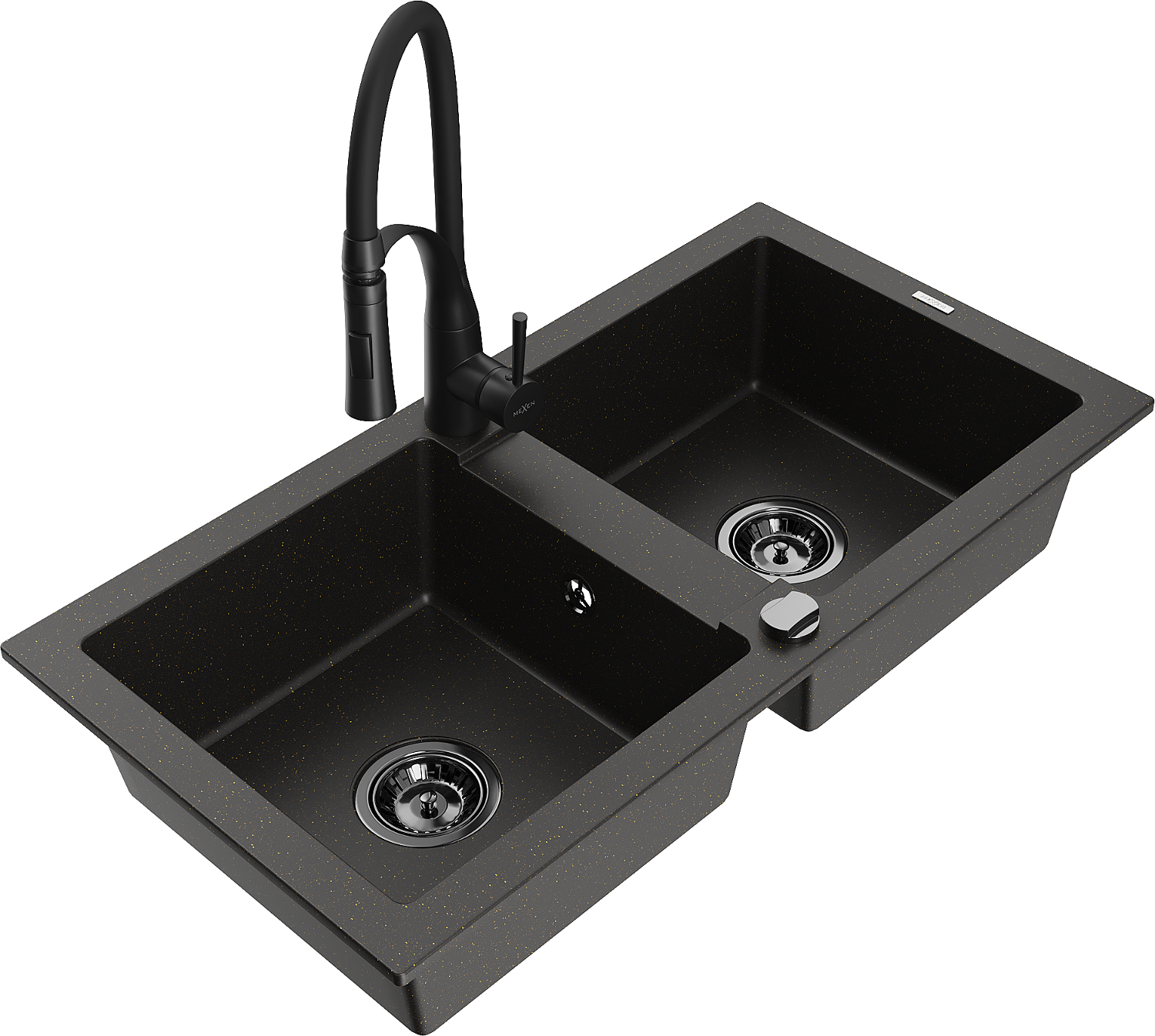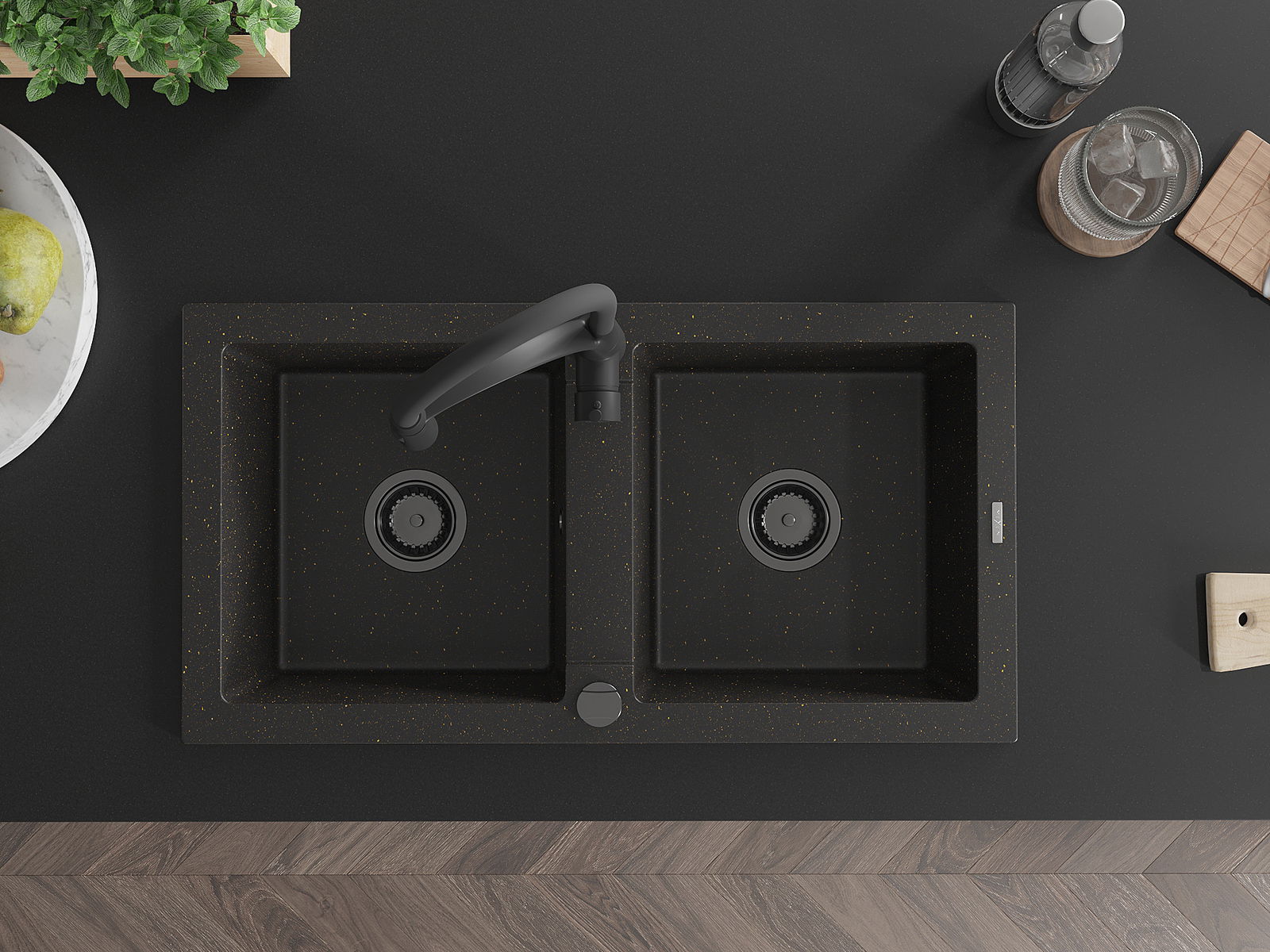Mexen Mario chiuvetă de granit cu 2 compartimente și baterie de bucătărie Aster, negru/auriu metalizat - 6504-75-73450-70-B