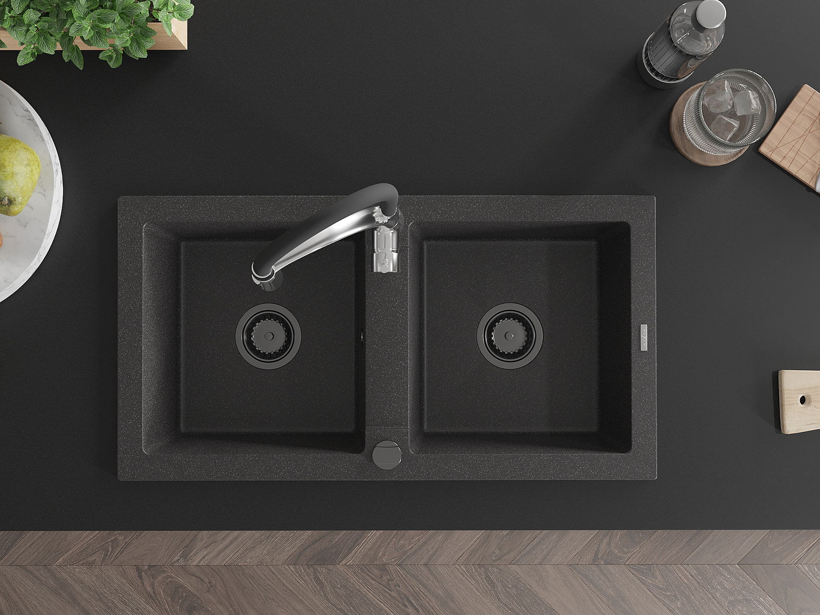 Mexen Mario chiuvetă de bucătărie din granit cu 2 compartimente și baterie de bucătărie Aster, negru pătat - 6504-76-73450-07-B