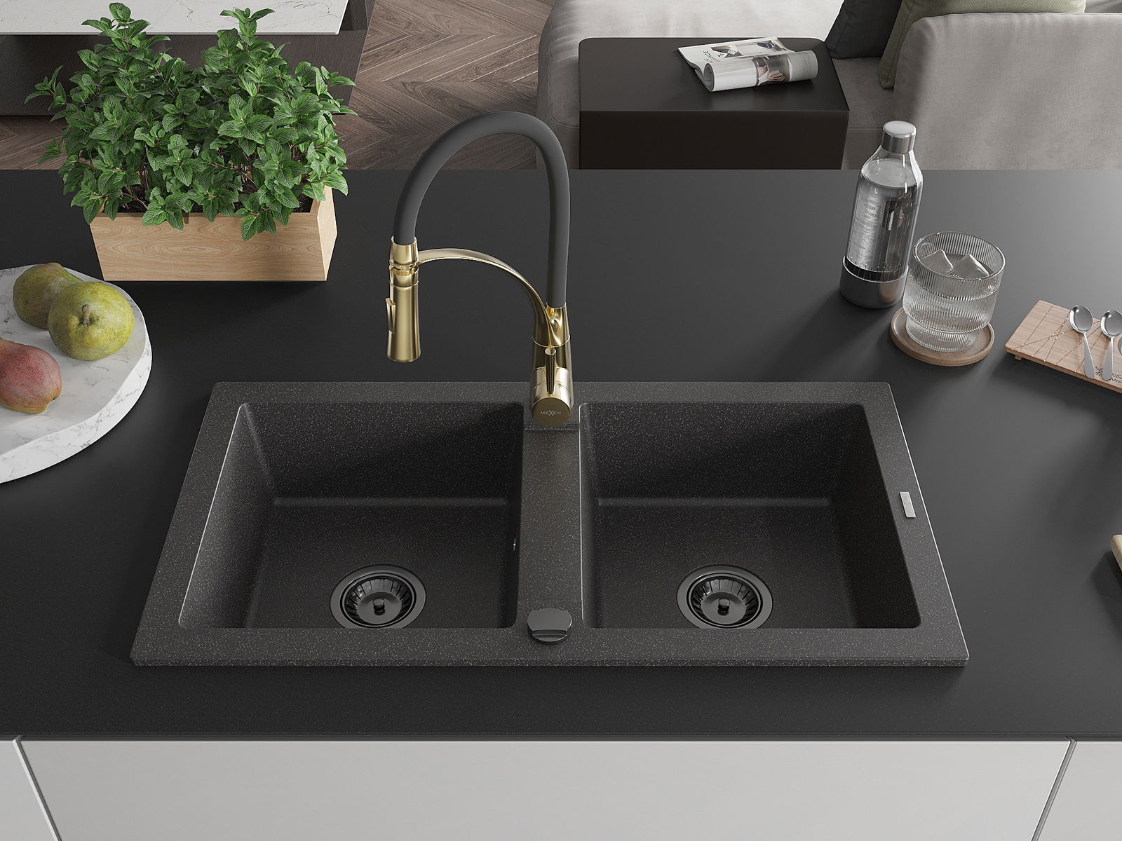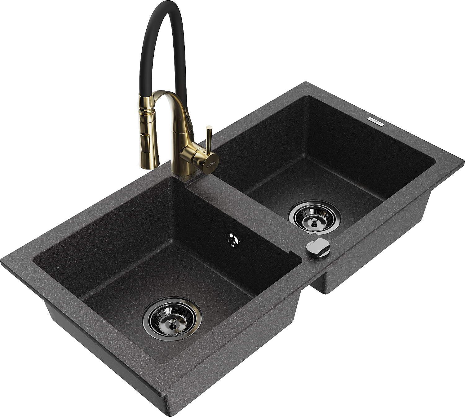 Mexen Mario chiuvetă de bucătărie granit cu 2 compartimente și robinet de bucătărie Aster, negru pătat - 6504-76-73450-57-B