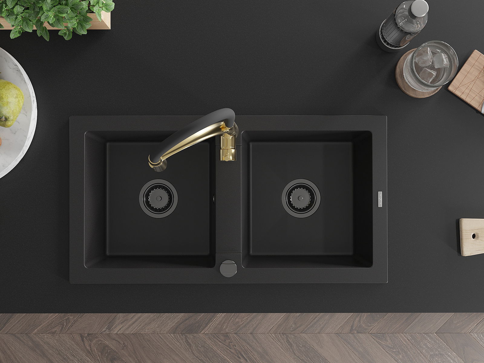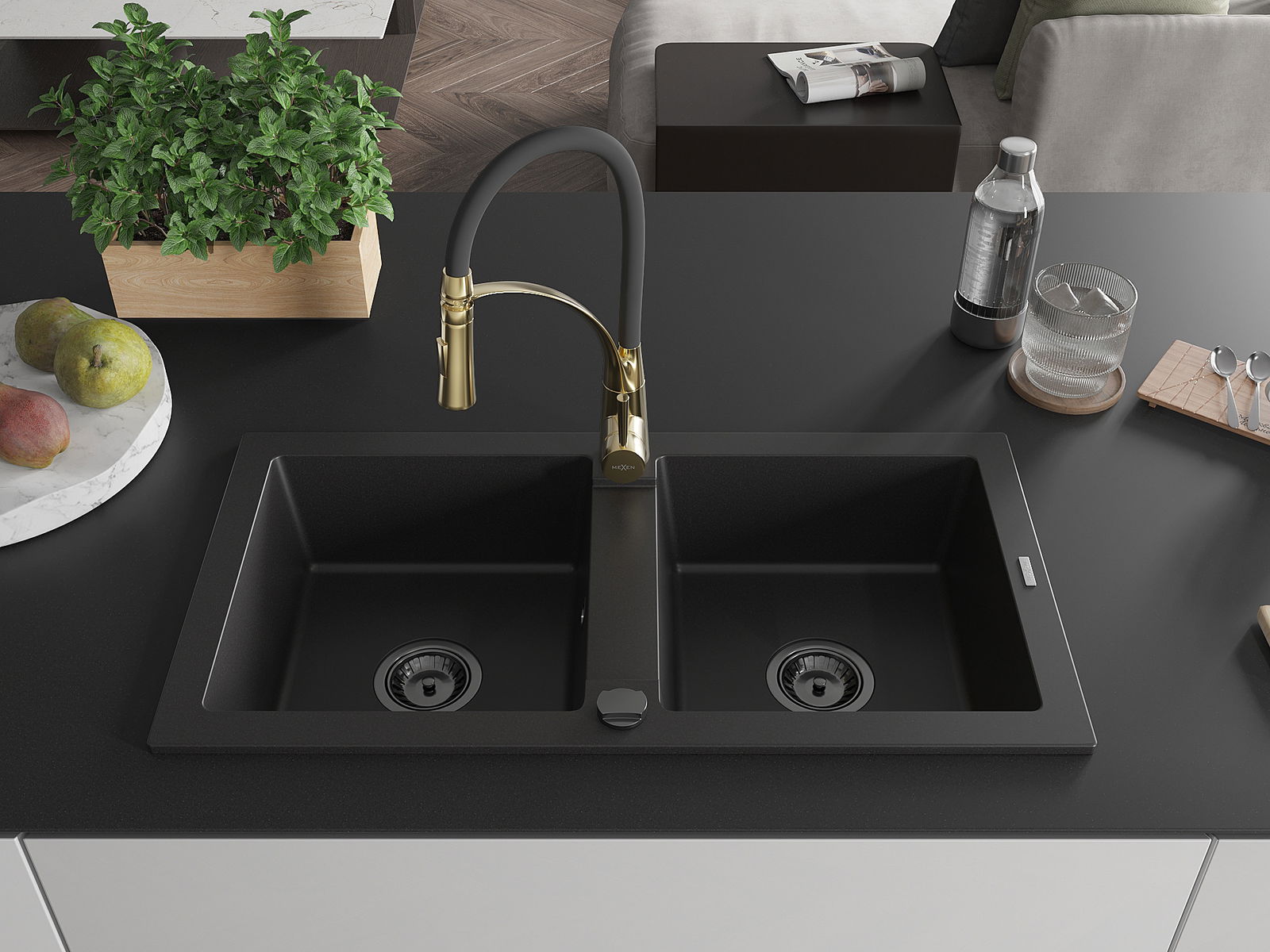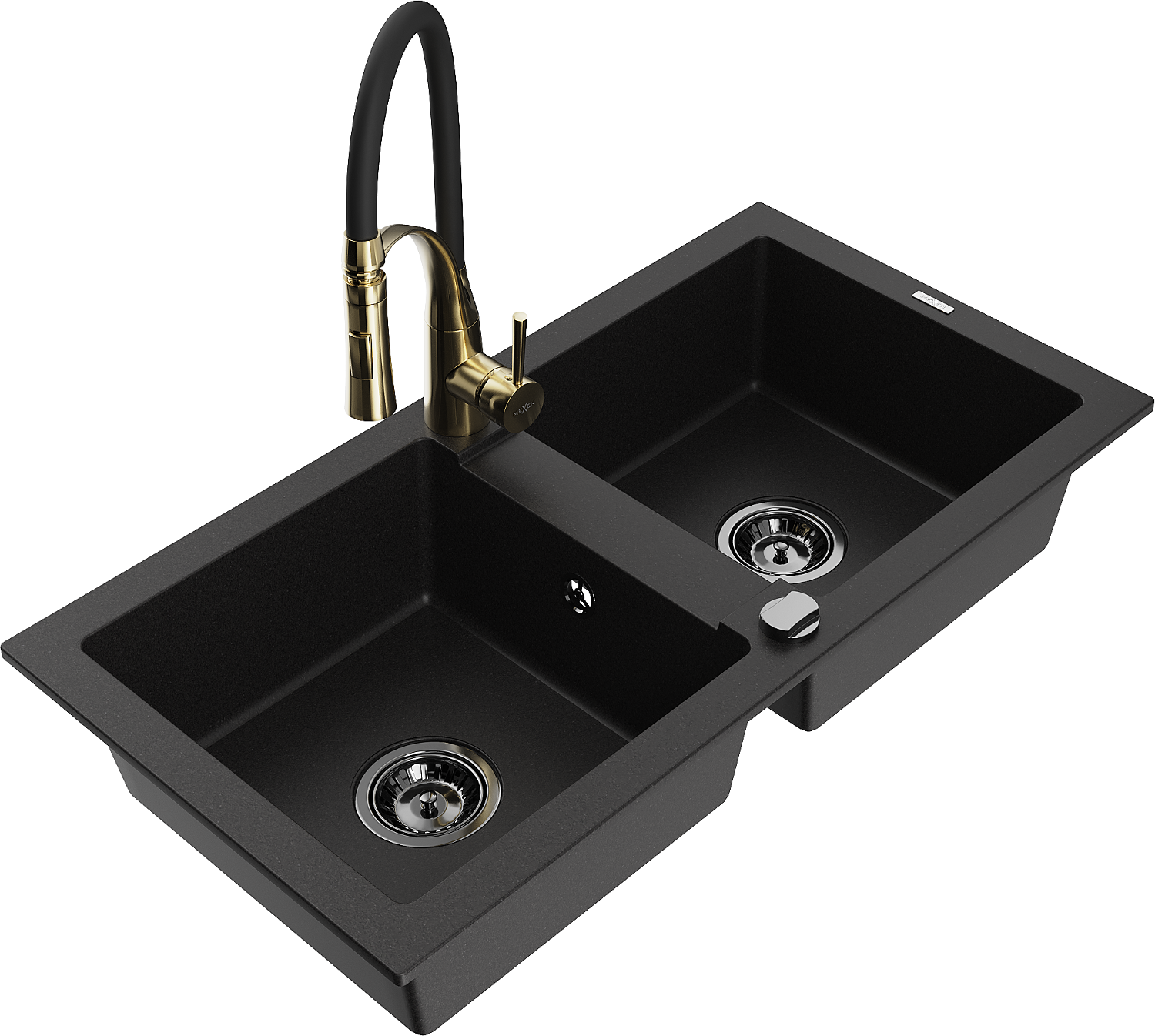 Mexen Mario chiuvetă de bucătărie din granit cu 2 compartimente și baterie de bucătărie Aster, negru - 6504-77-73450-57-B