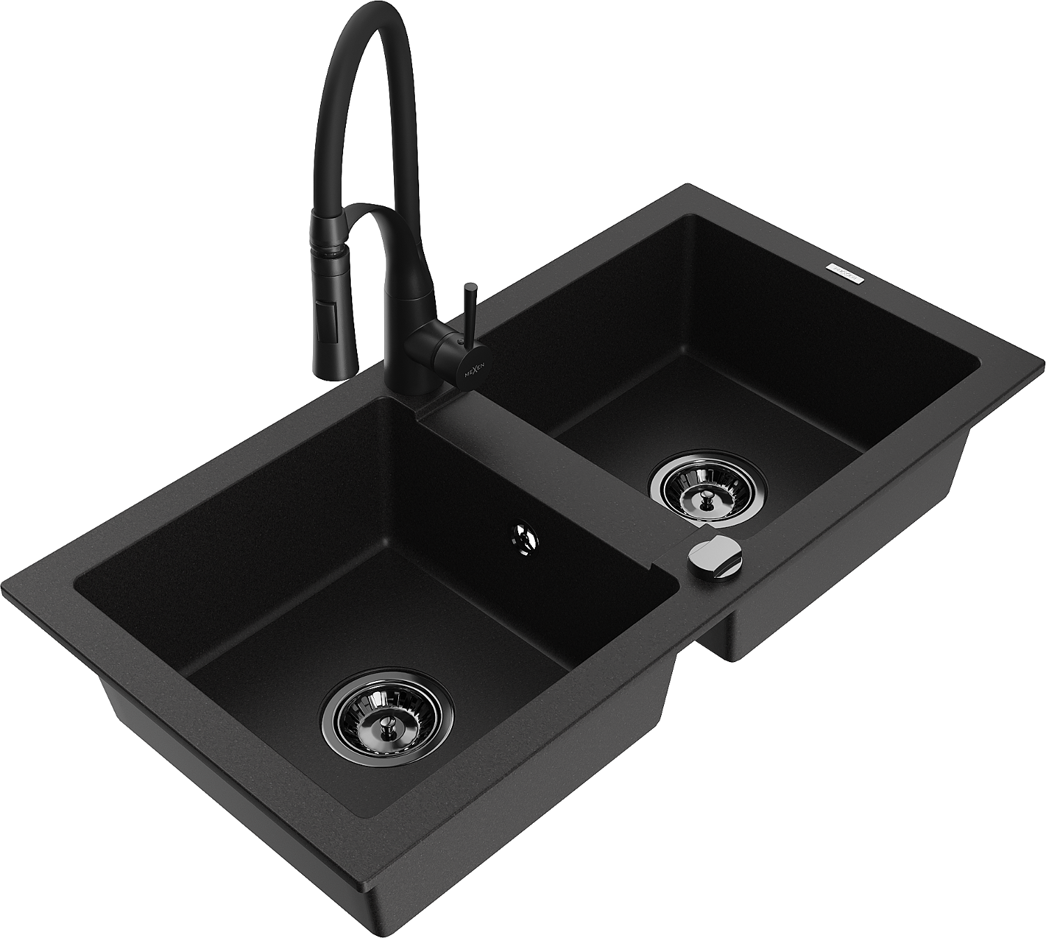 Mexen Mario chiuvetă de bucătărie din granit cu 2 compartimente și baterie de bucătărie Aster, negru - 6504-77-73450-70-B