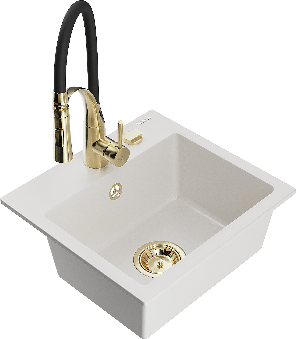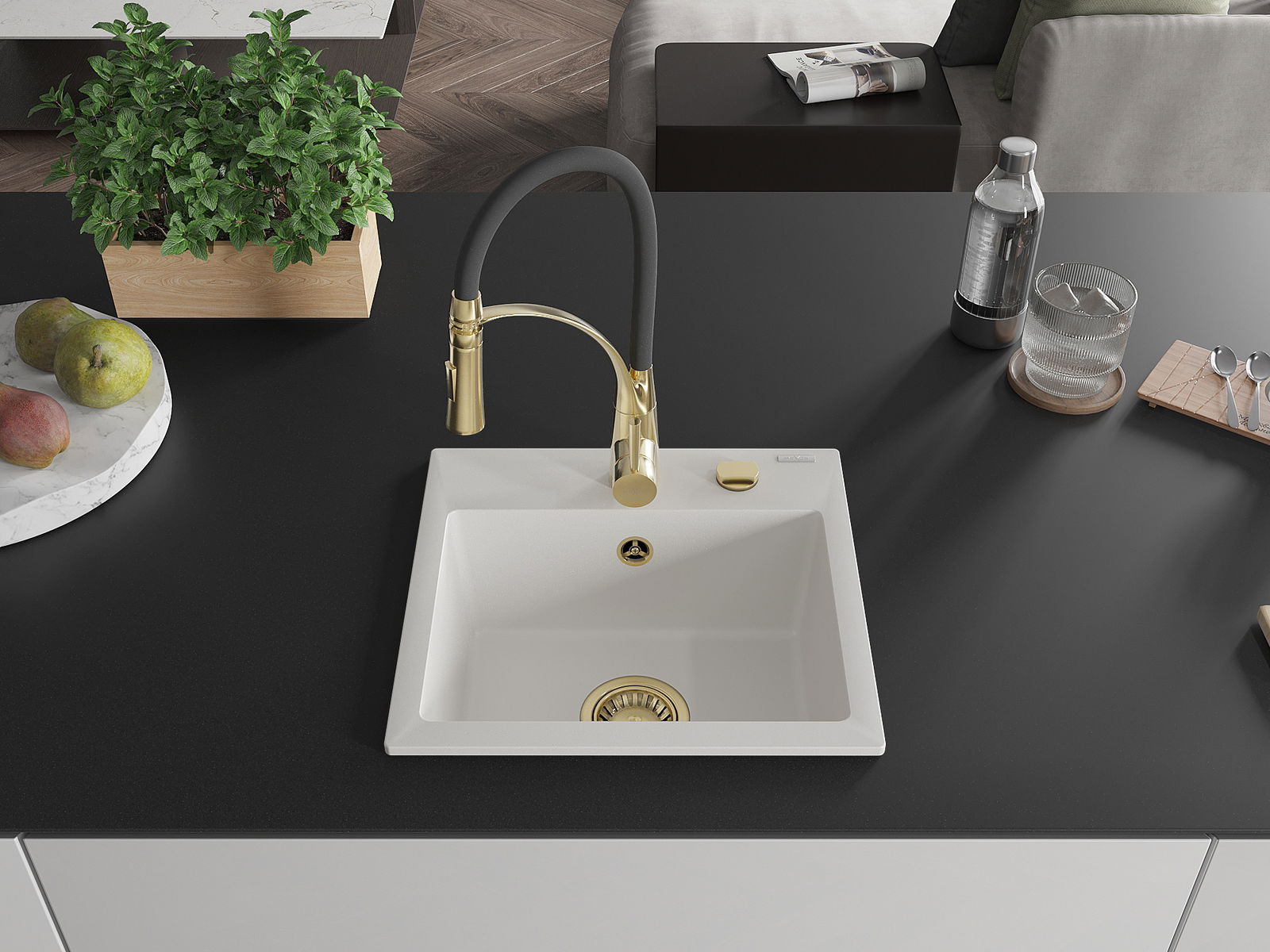 Mexen Milo chiuvetă de bucătărie din granit cu 1 compartiment și baterie Aster, alb - 6505-20-73450-57-G