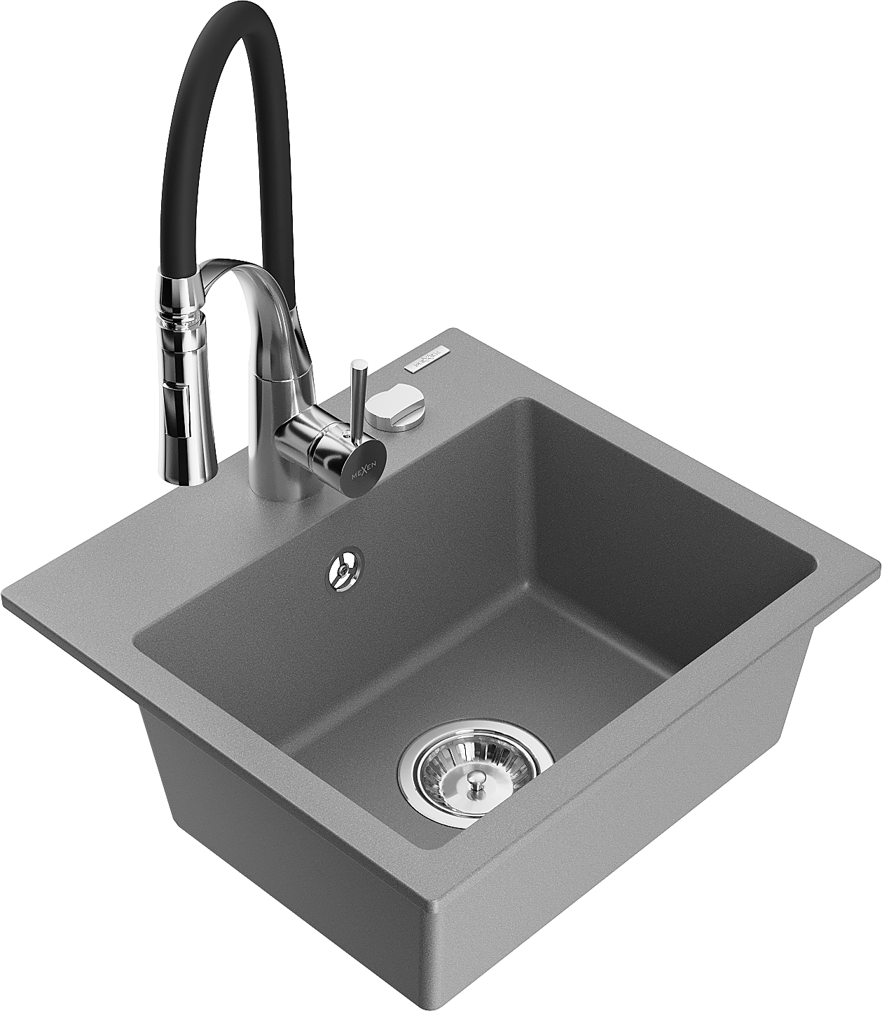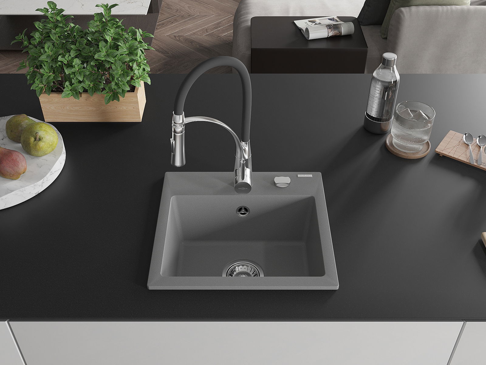 Mexen Milo chiuvetă de granit cu o singură cuvă cu baterie de bucătărie Aster, gri - 6505-71-73450-07