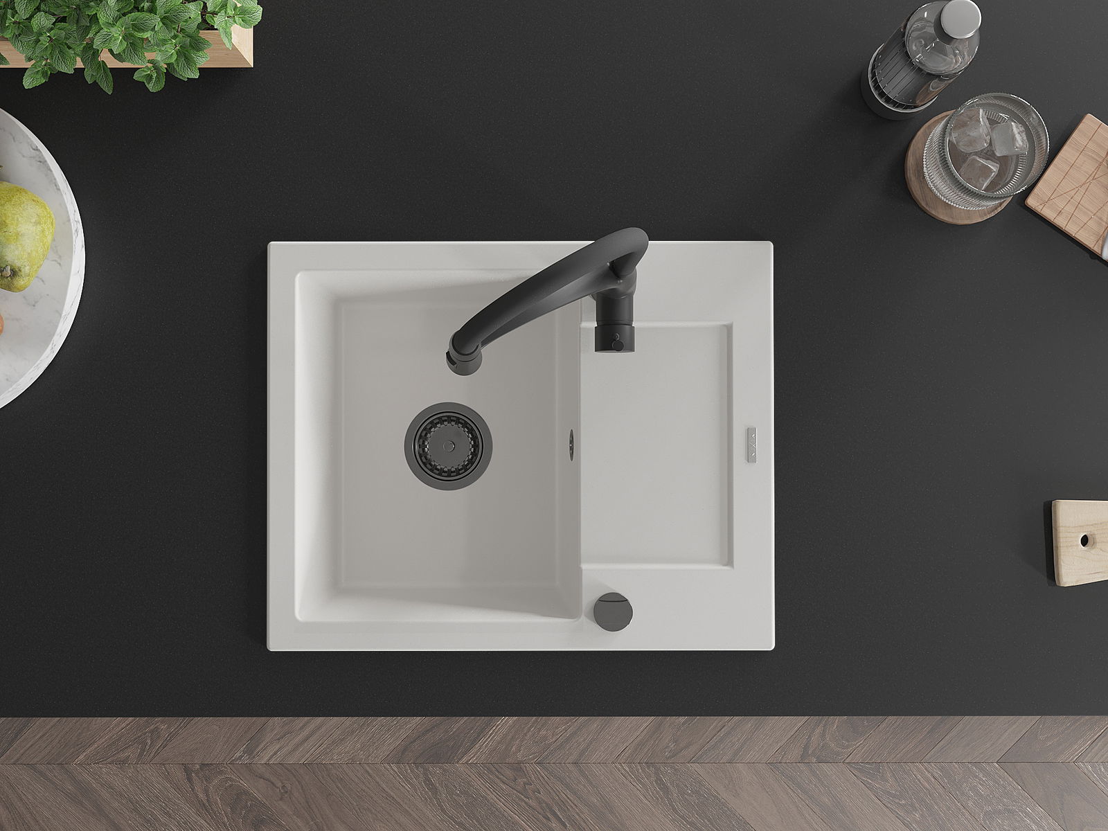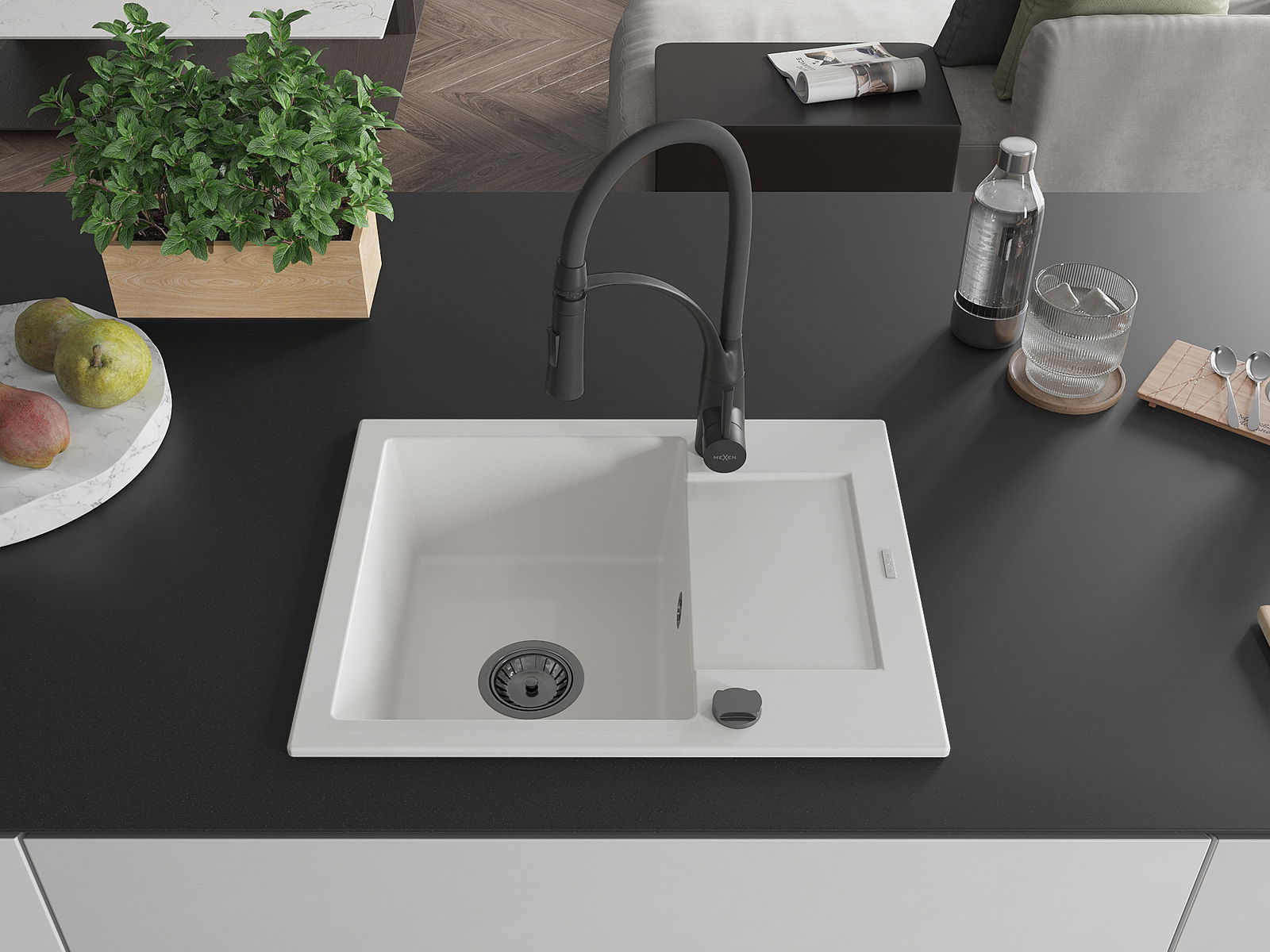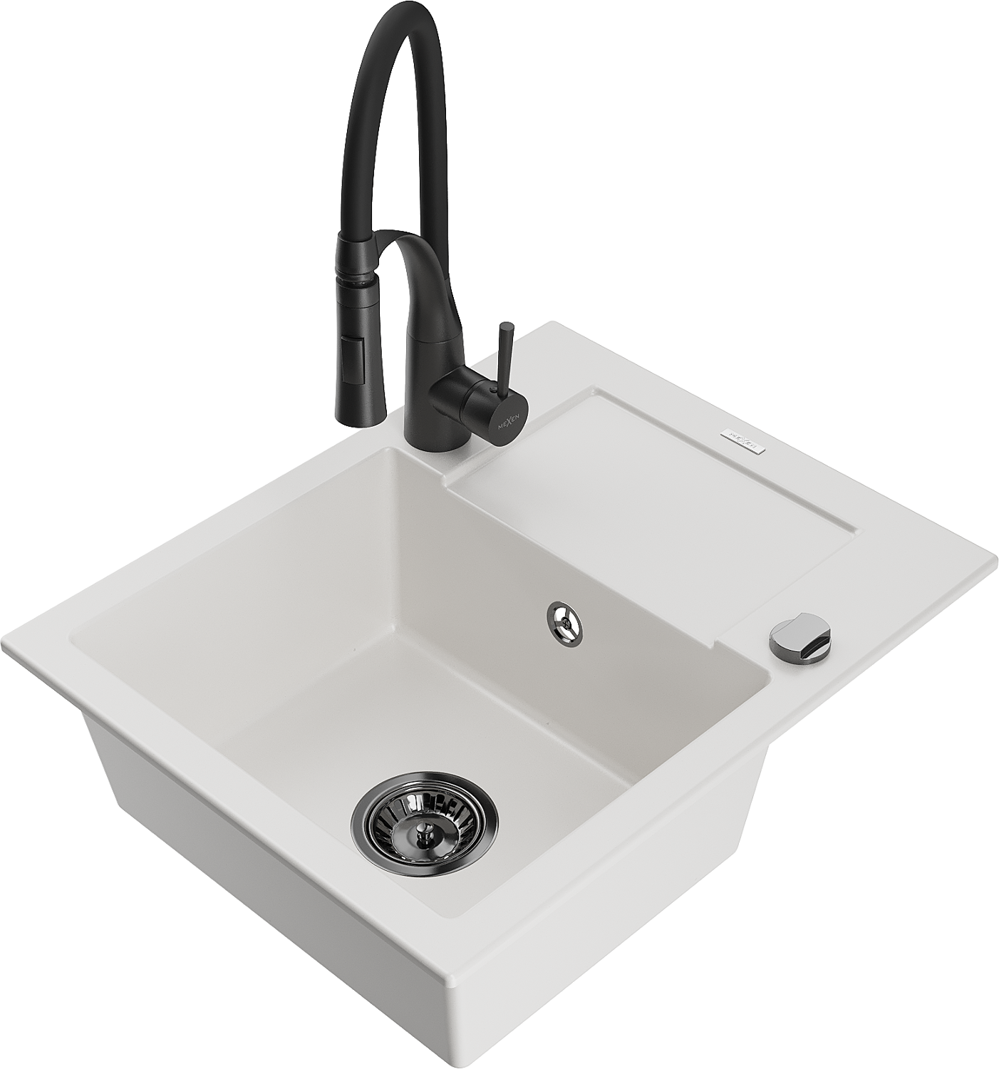 Mexen Enzo chiuvetă de granit cu 1 compartiment cu scurgător și baterie de bucătărie Aster, alb - 6506-20-73450-70-B