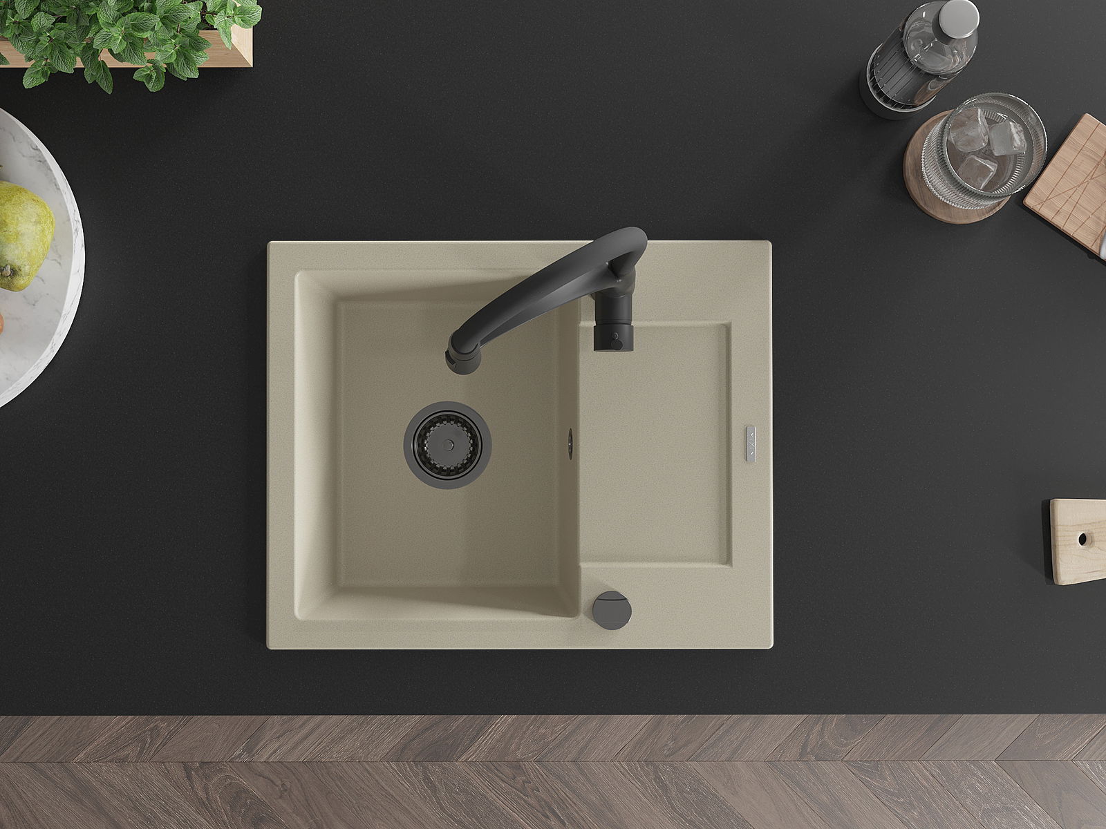 Mexen Enzo chiuvetă de bucătărie din granit cu 1 compartiment, picurător și baterie Aster, bej - 6506-69-73450-70-B