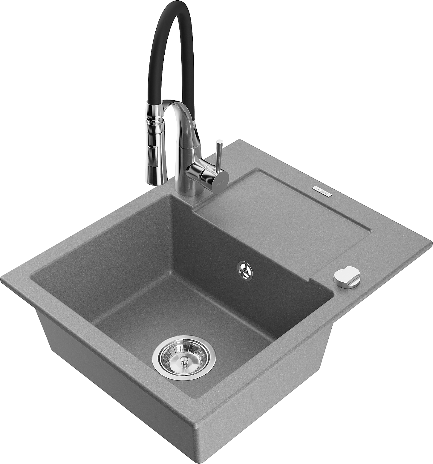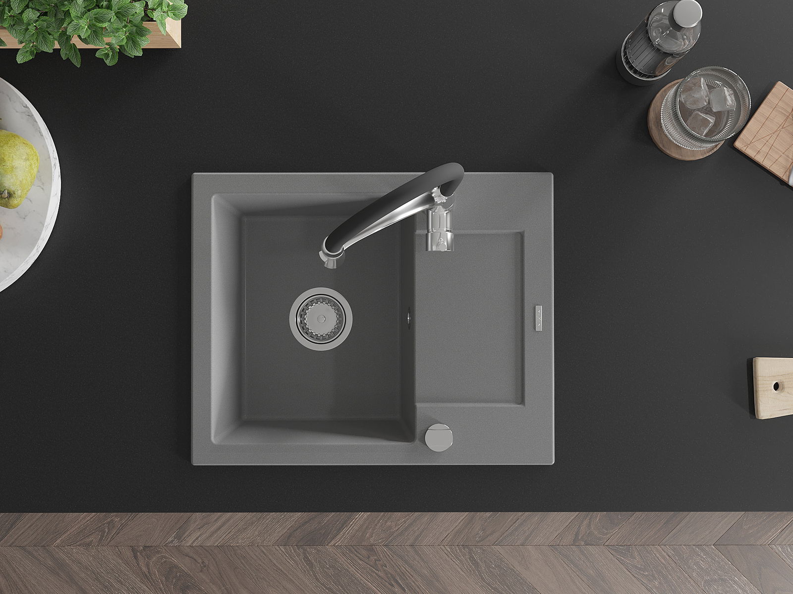 Mexen Enzo chiuvetă de granit cu 1 compartiment, cu scurgător și baterie de bucătărie Aster, gri - 6506-71-73450-07