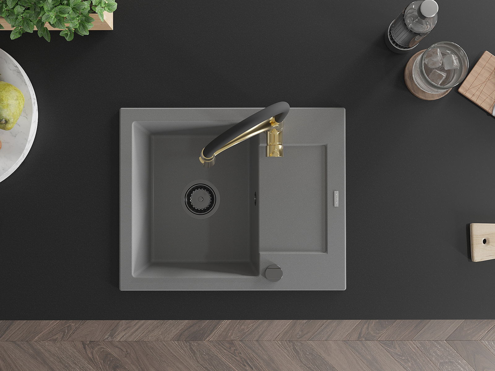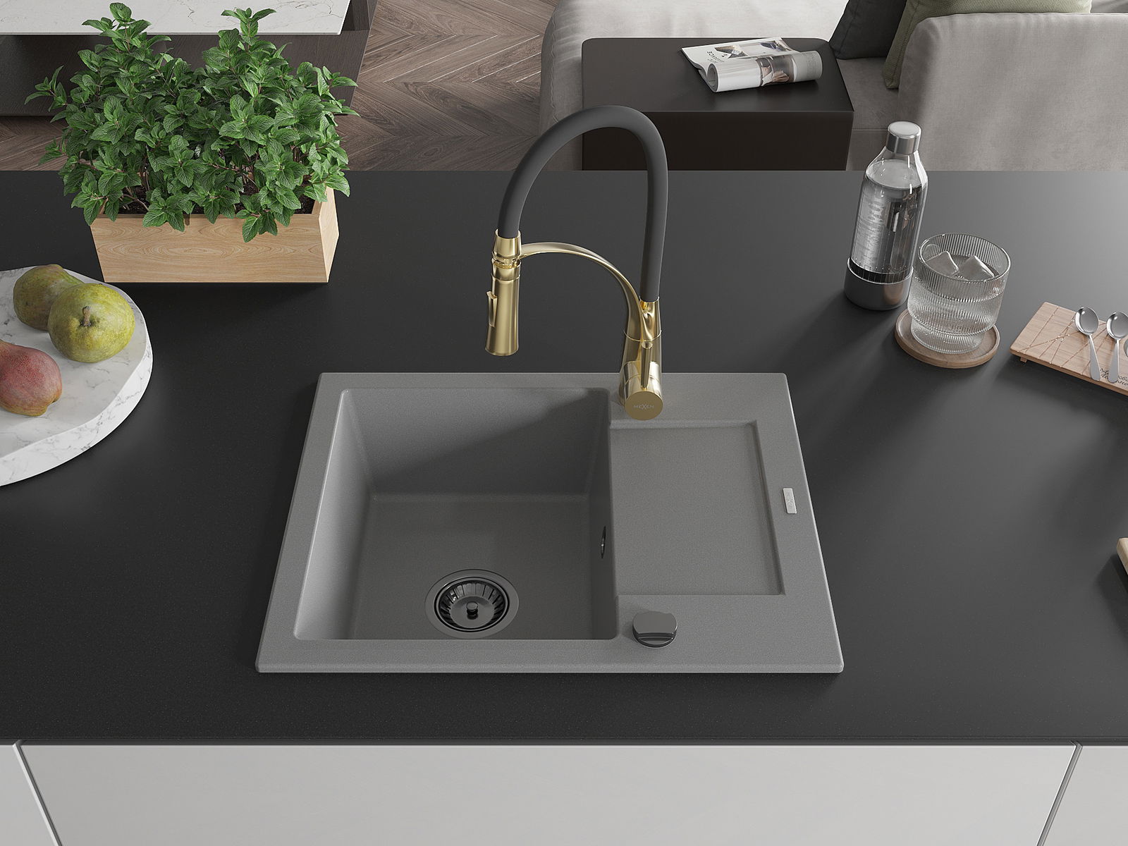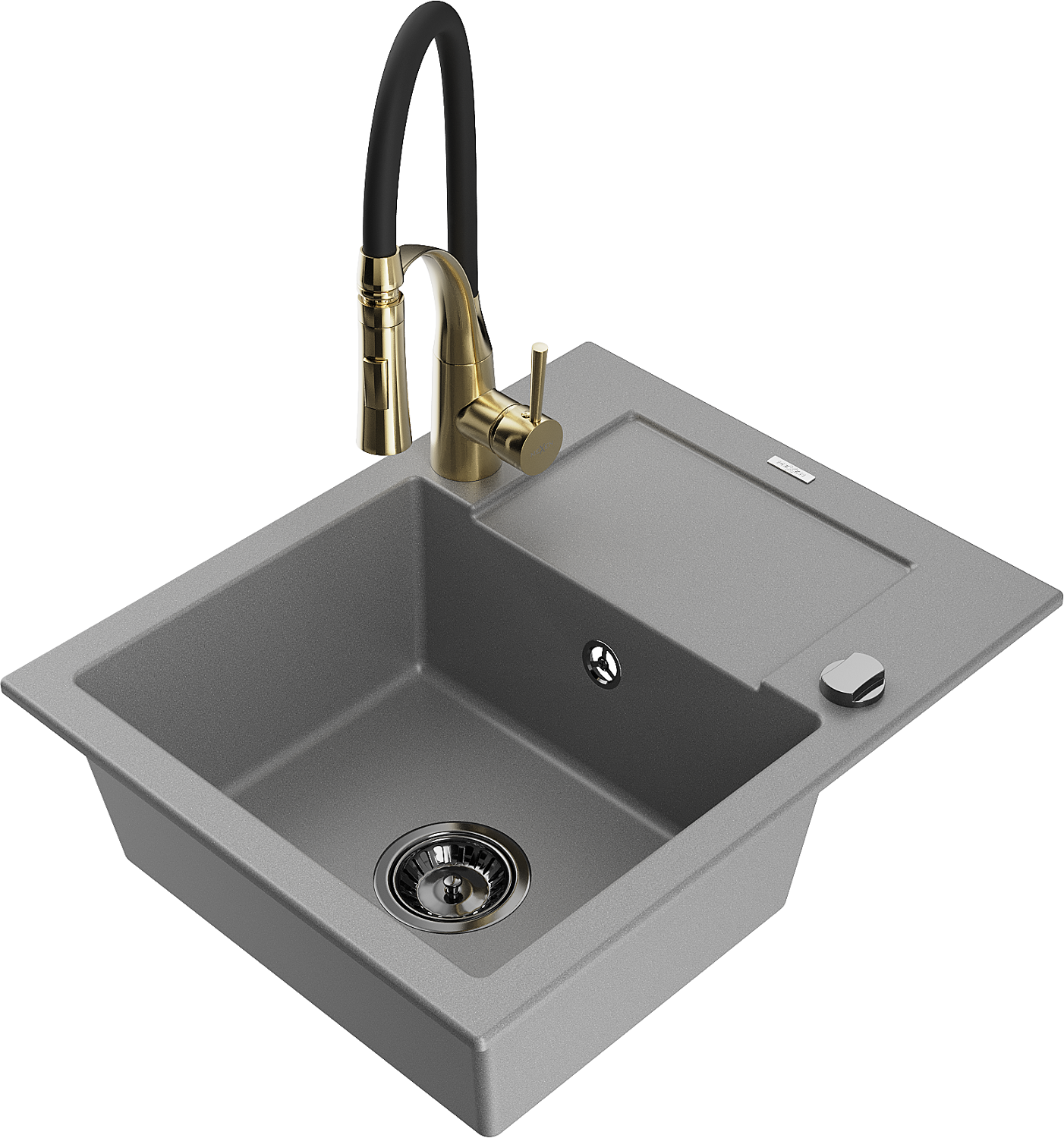 Mexen Enzo chiuvetă de bucătărie granit 1-cameră cu scurgător și baterie de bucătărie Aster, gri - 6506-71-73450-57-B