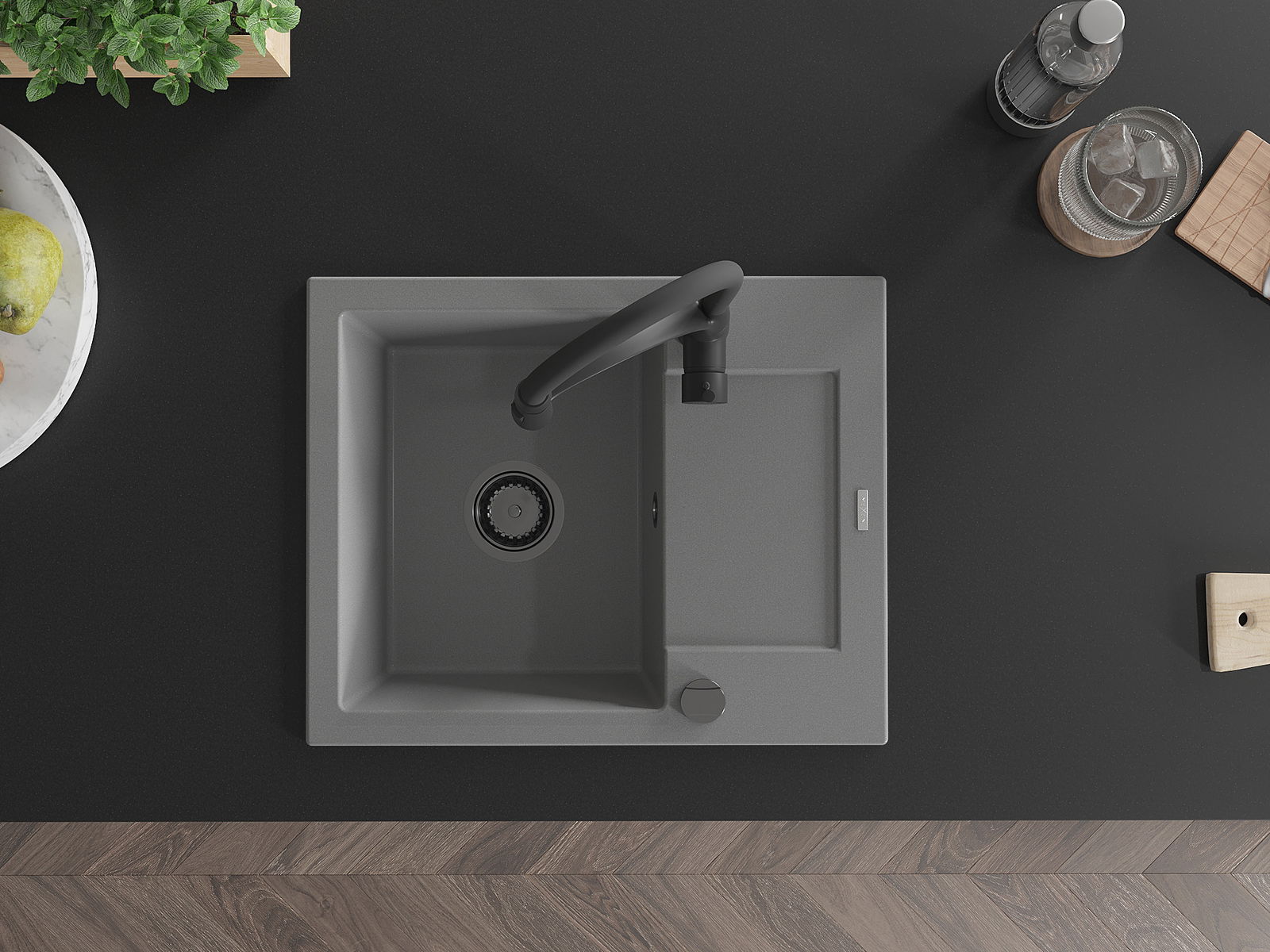 Mexen Enzo chiuvetă de granit cu 1 compartiment cu scurgător și baterie de bucătărie Aster, gri - 6506-71-73450-70-B