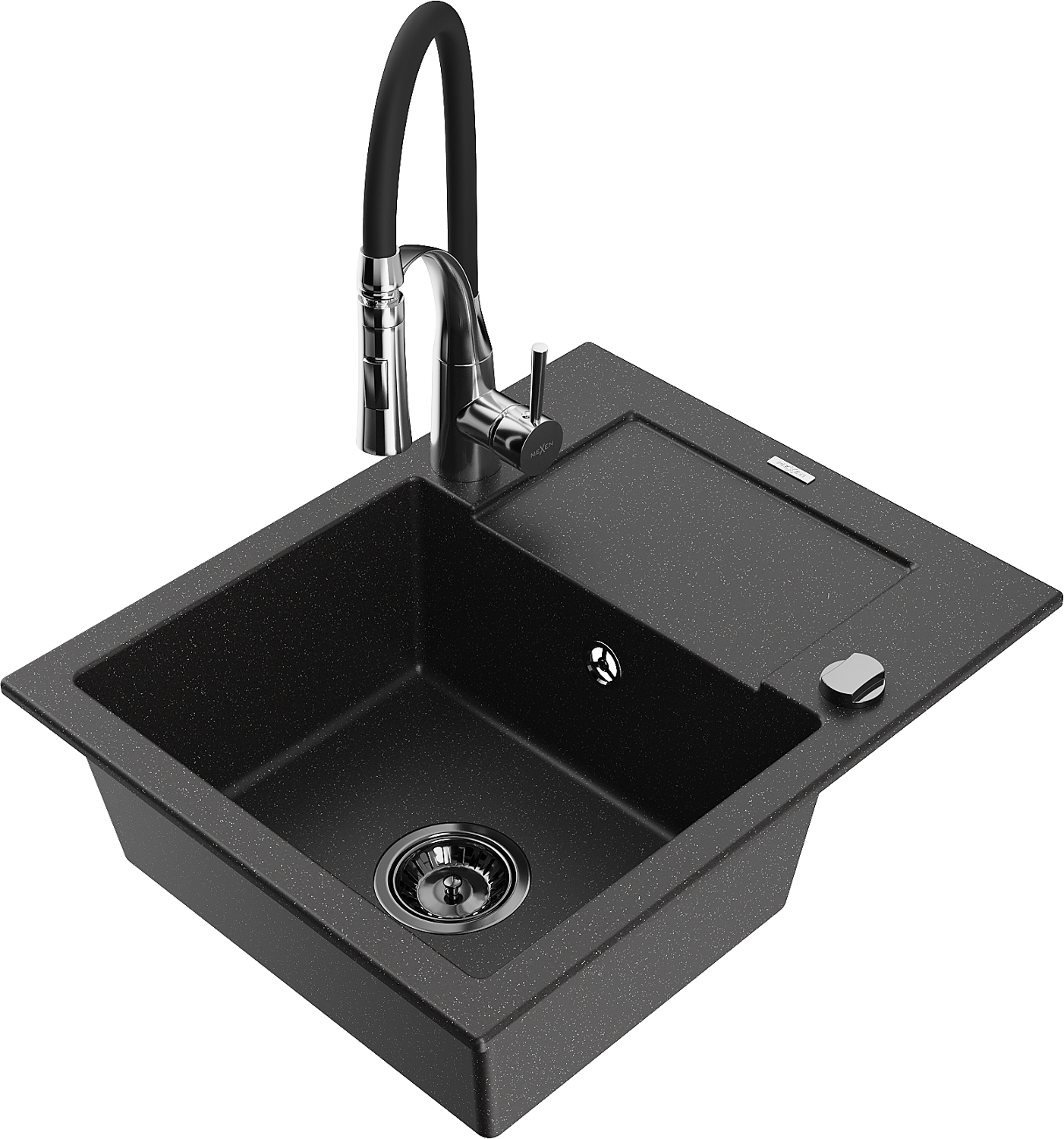 Mexen Enzo chiuvetă de bucătărie din granit cu o cuvă, cu picurător și baterie de bucătărie Aster, negru/metal argintiu