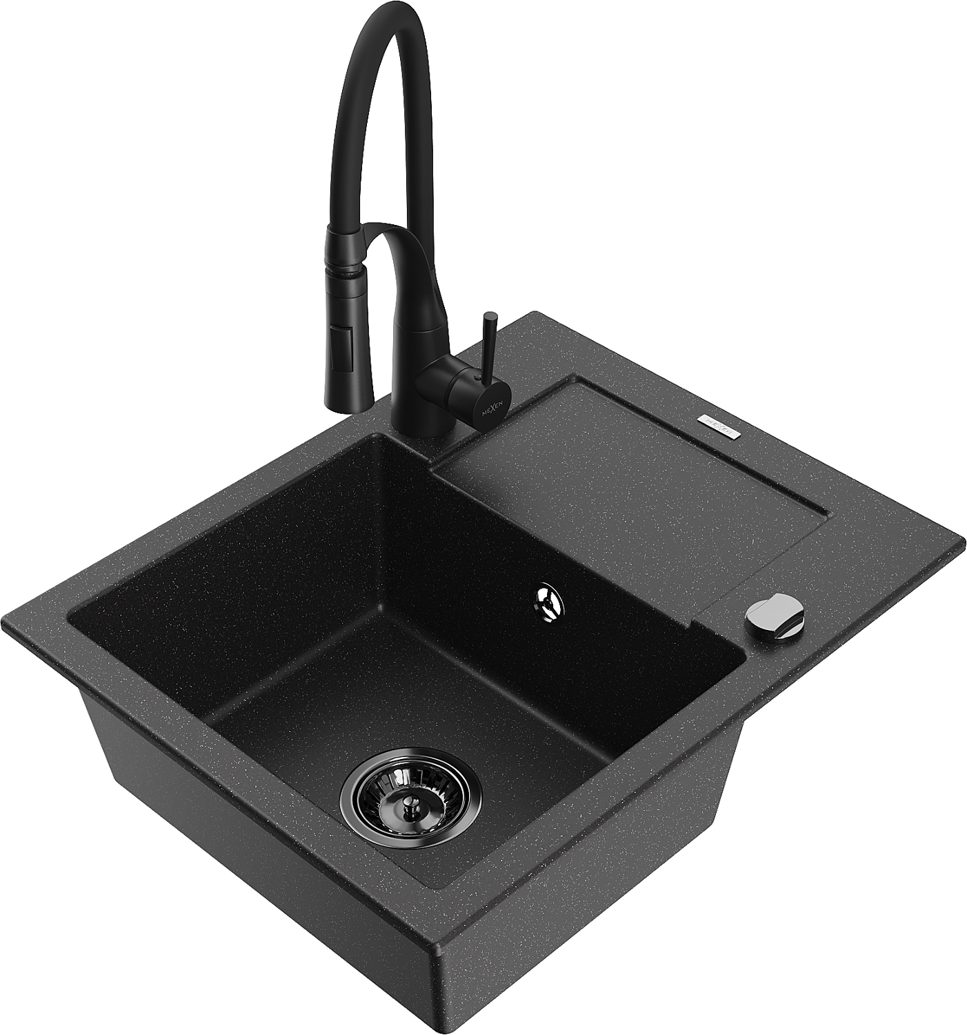 Mexen Enzo chiuvetă de granit cu 1 compartiment cu scurgător și baterie de bucătărie Aster, negru/metalizat argintiu
