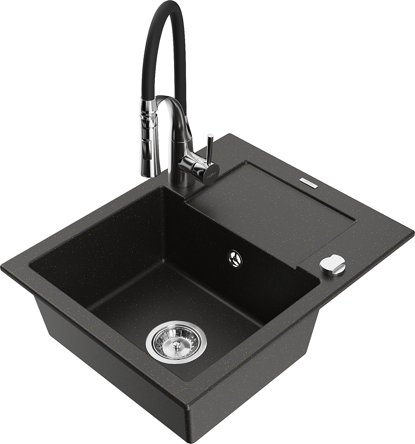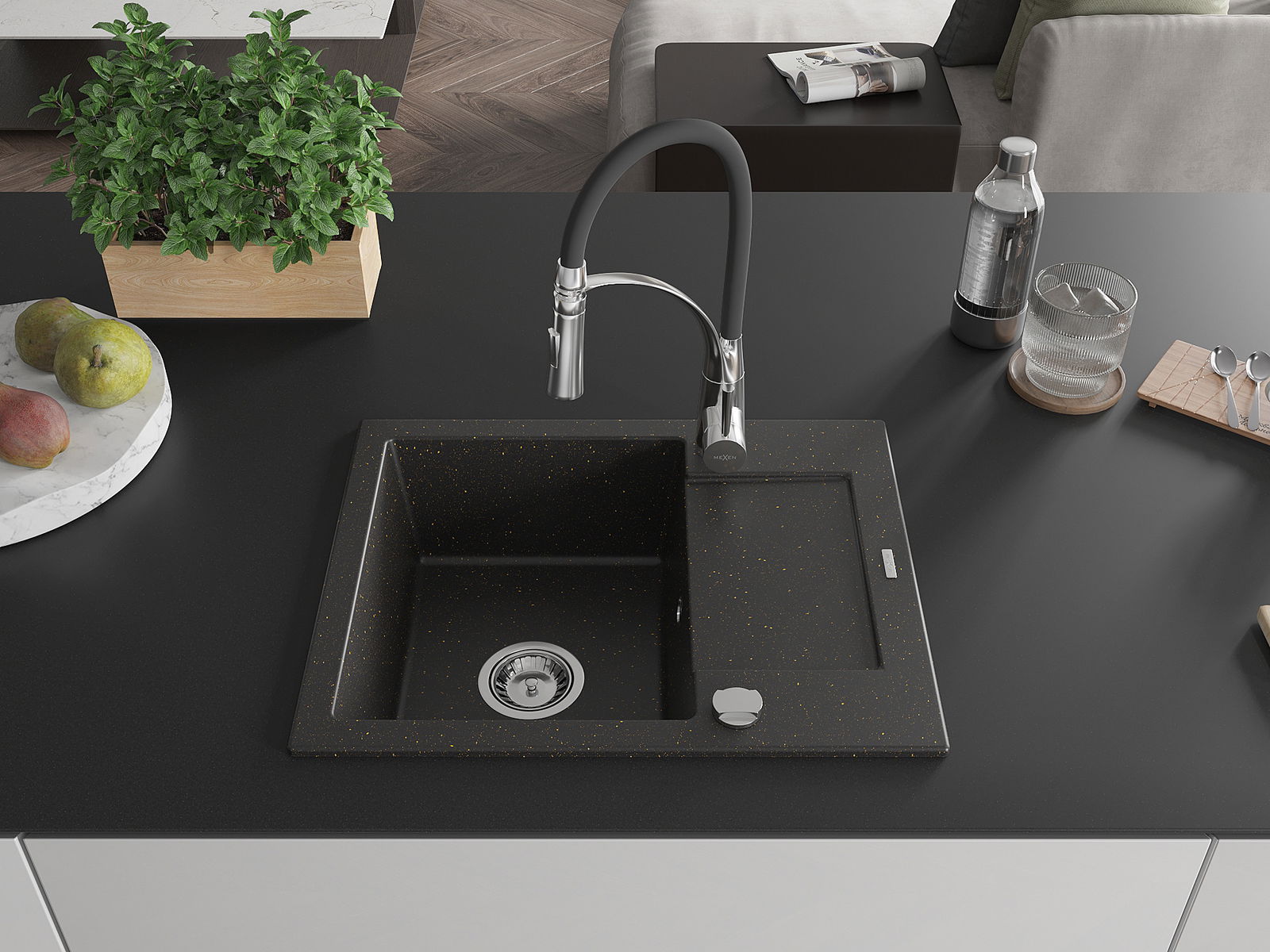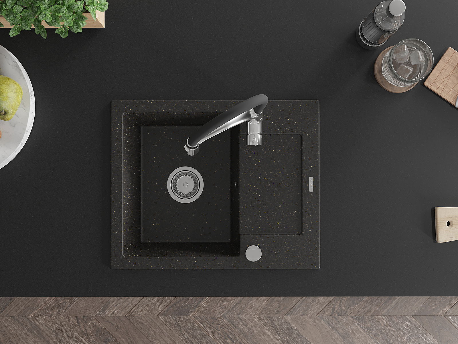 Mexen Enzo chiuvetă de bucătărie din granit cu 1 compartiment, cu scurgător și baterie de bucătărie Aster, negru/auriu