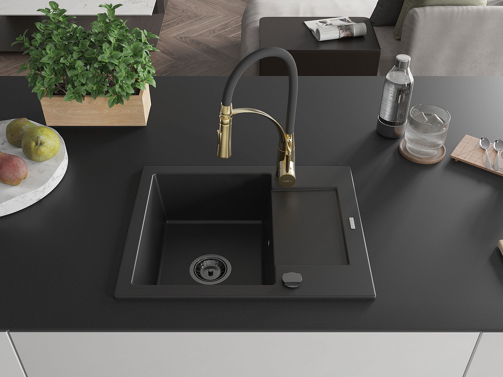 Mexen Enzo chiuvetă de bucătărie din granit cu 1 cuvă și scurgător și baterie de bucătărie Aster, negru - 6506-77-73450-57-B