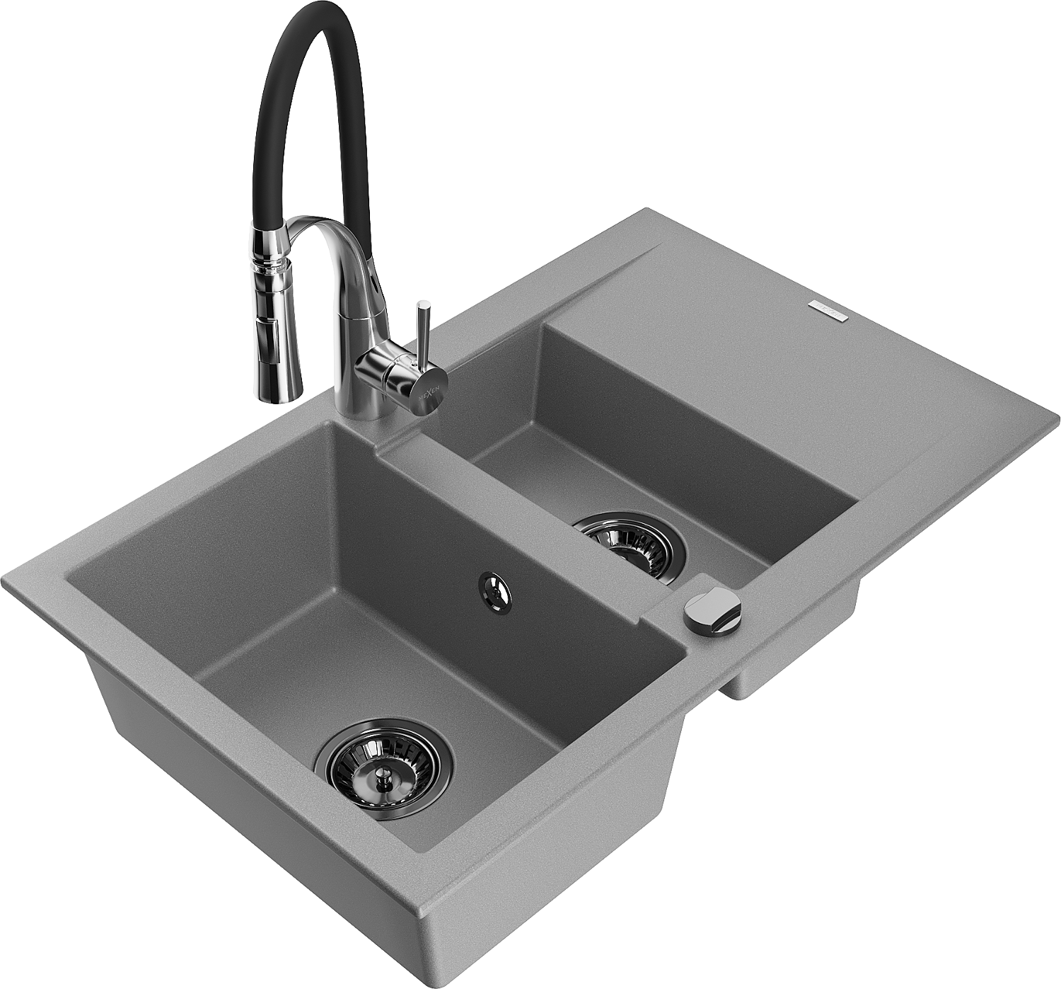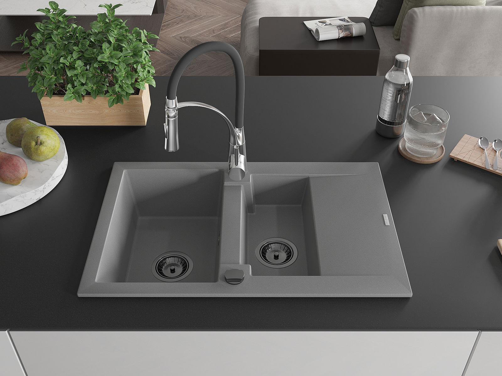 Mexen Gaspar chiuvetă din granit cu 1,5 camere cu scurgător și baterie de bucătărie Aster, gri - 6507-71-73450-07-B