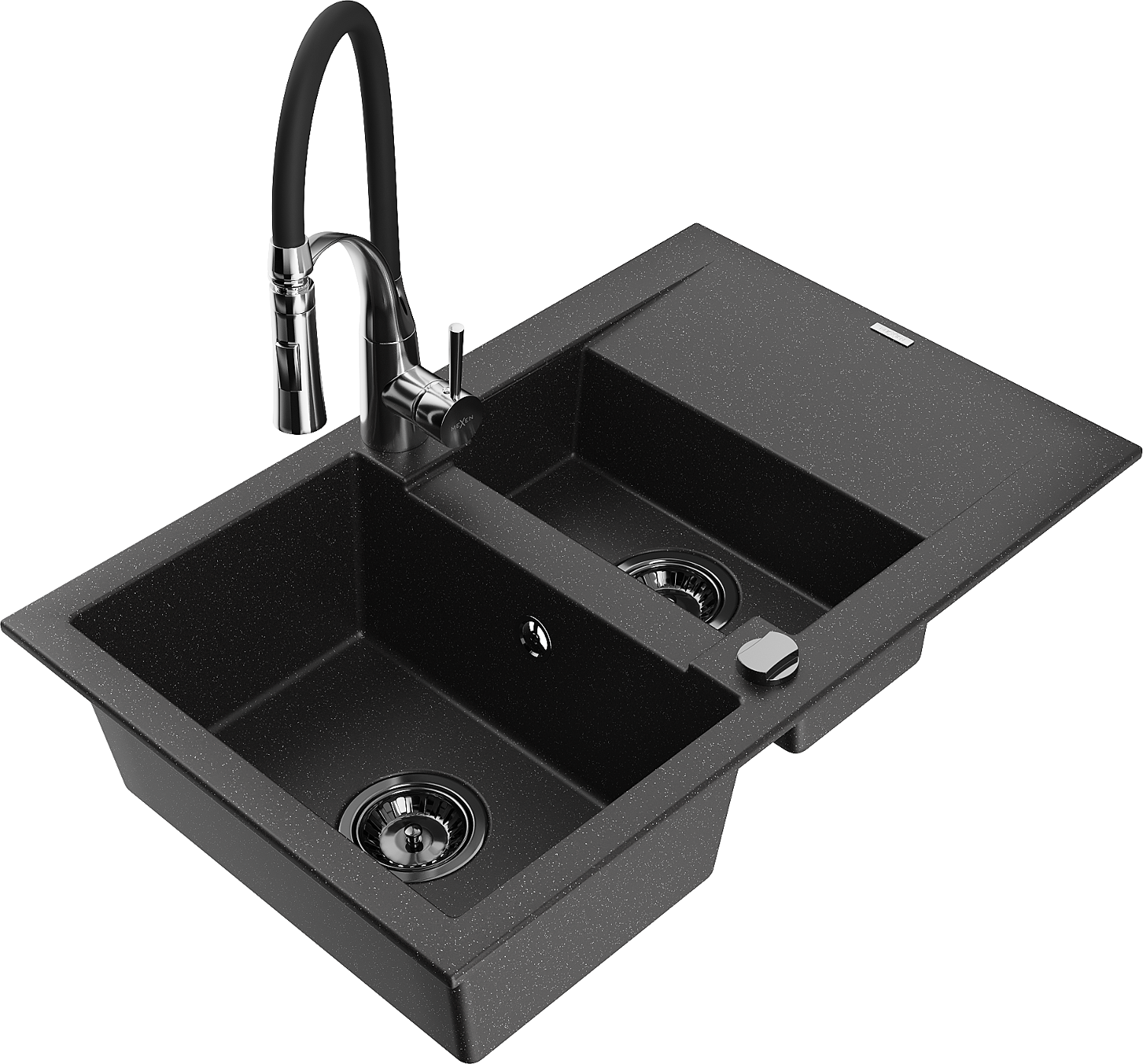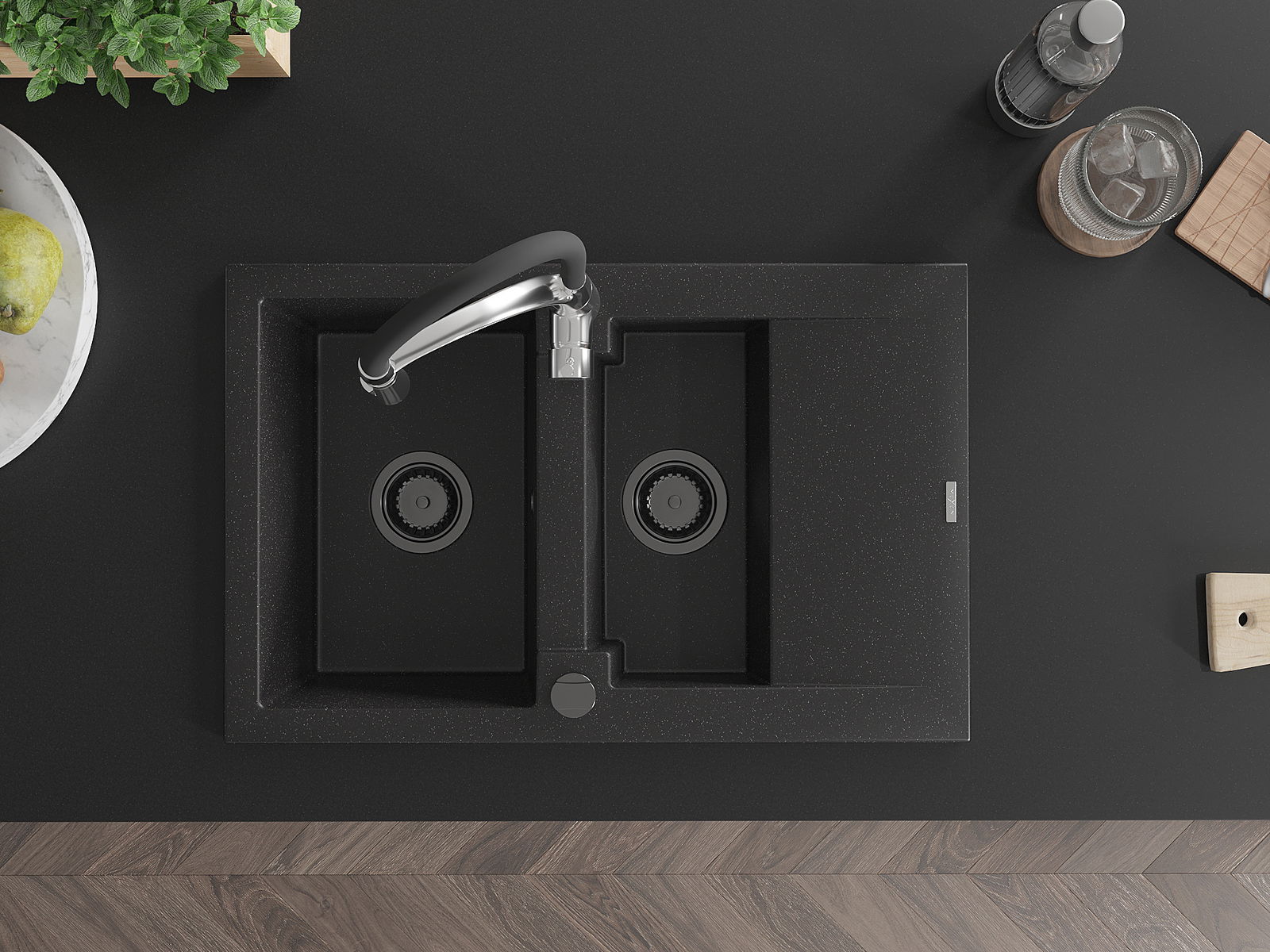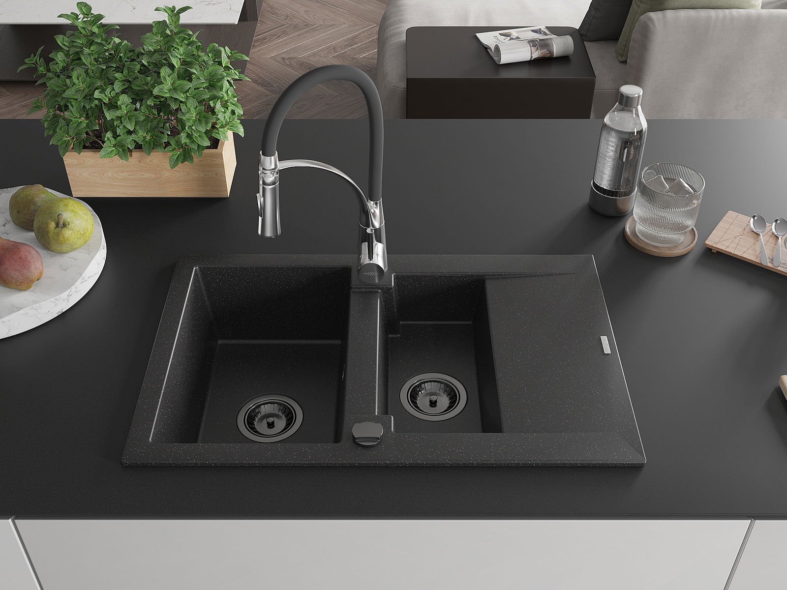 Mexen Gaspar chiuvetă din granit cu 1,5 cuve cu picurător și baterie de bucătărie Aster, negru/argintiu - 6507-73-73450-07-B