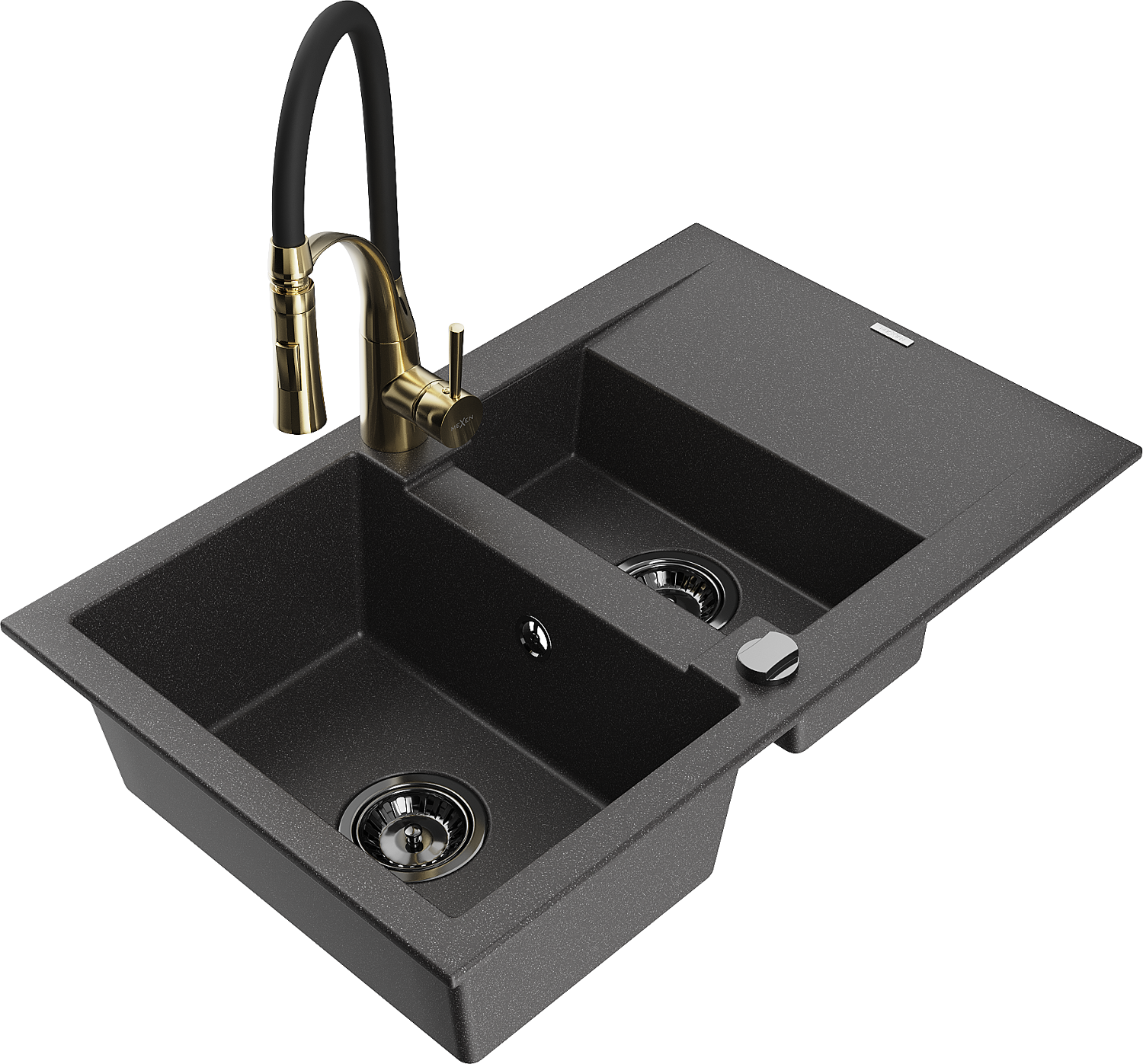 Mexen Gaspar chiuvetă de granit cu 1,5 cuve, cu scurgător și baterie de bucătărie Aster, negru pătat - 6507-76-73450-57-B