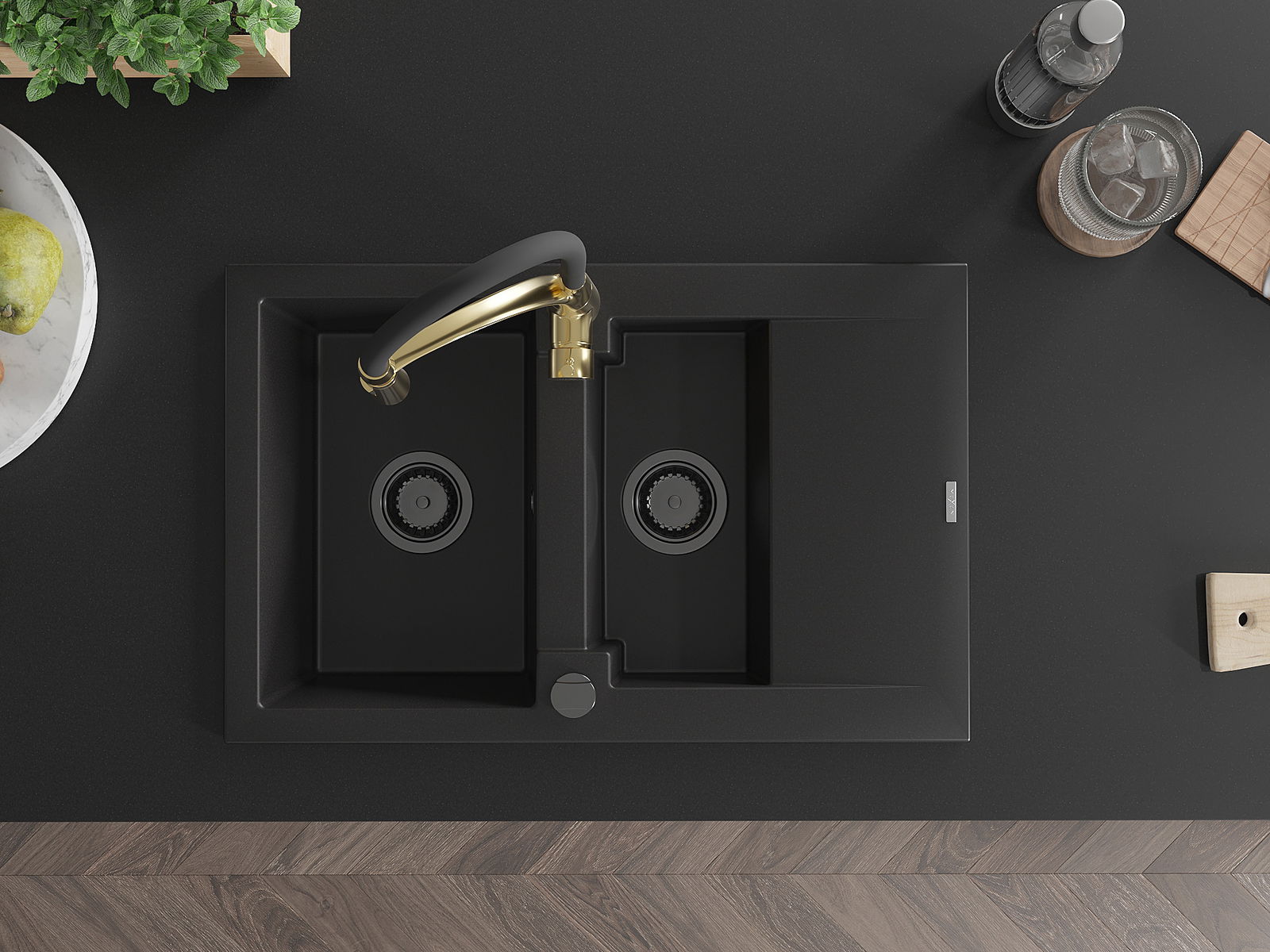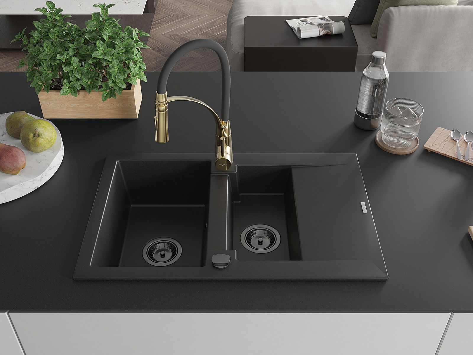 Mexen Gaspar chiuvetă de granit cu 1,5 compartimente cu scurgător și baterie de bucătărie Aster, negru - 6507-77-73450-57-B