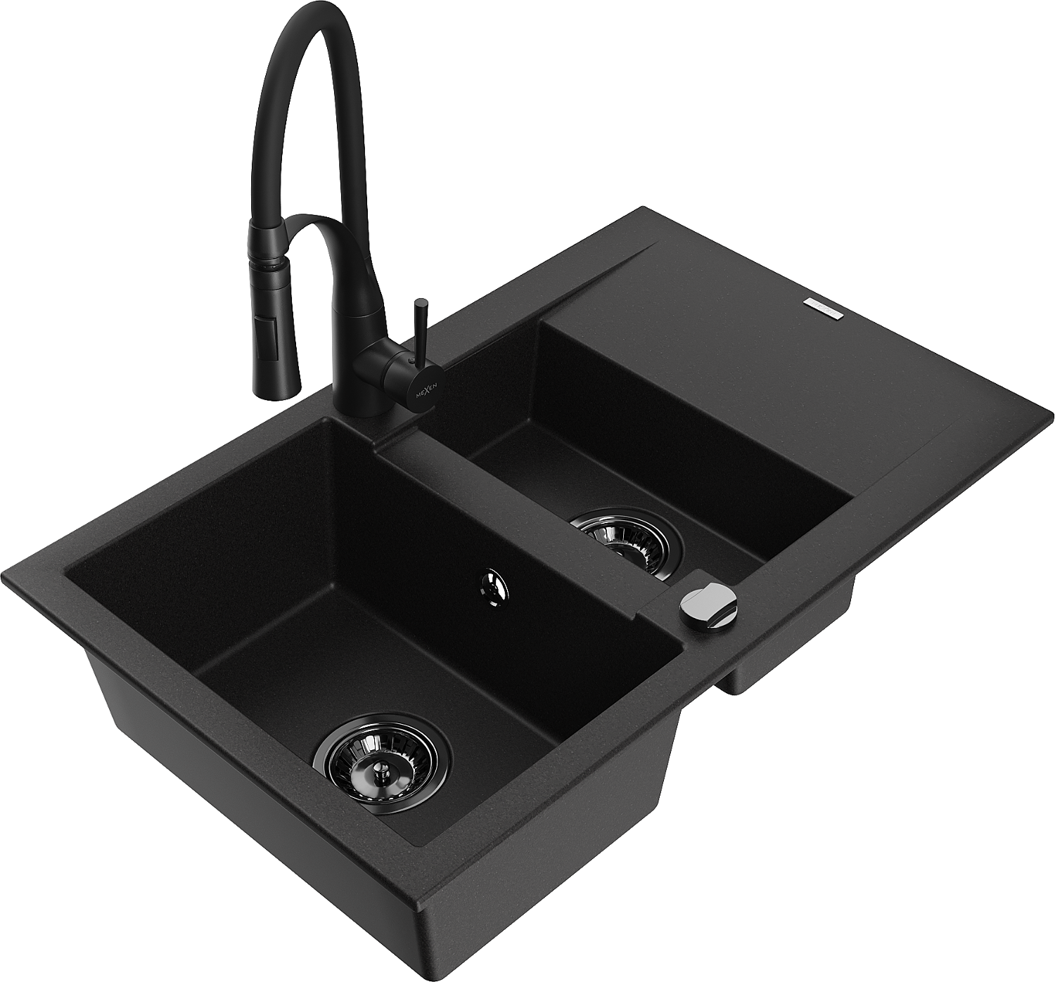 Mexen Gaspar chiuvetă din granit 1,5 compartimente cu picurător și baterie de bucătărie Aster, negru - 6507-77-73450-70-B