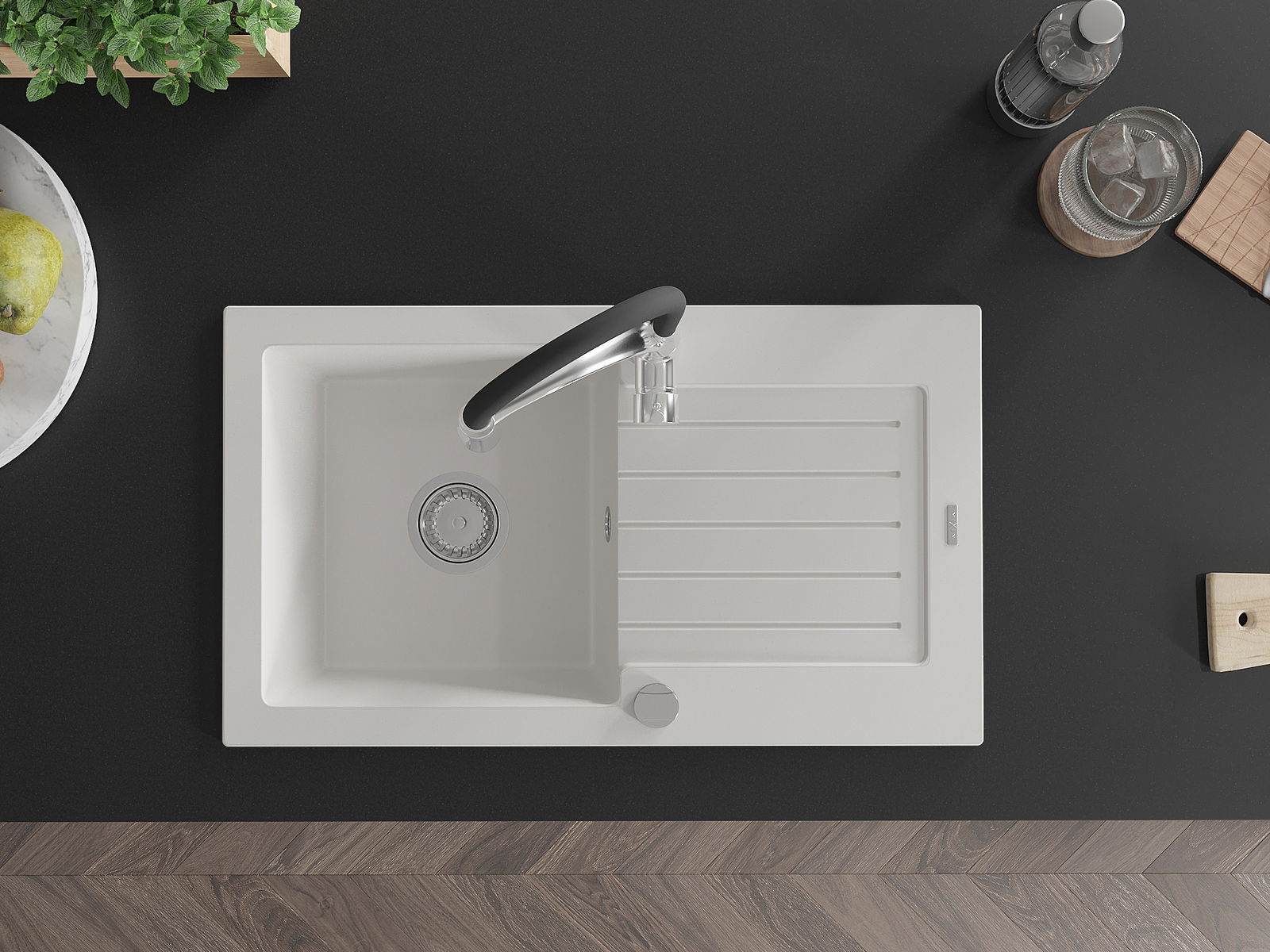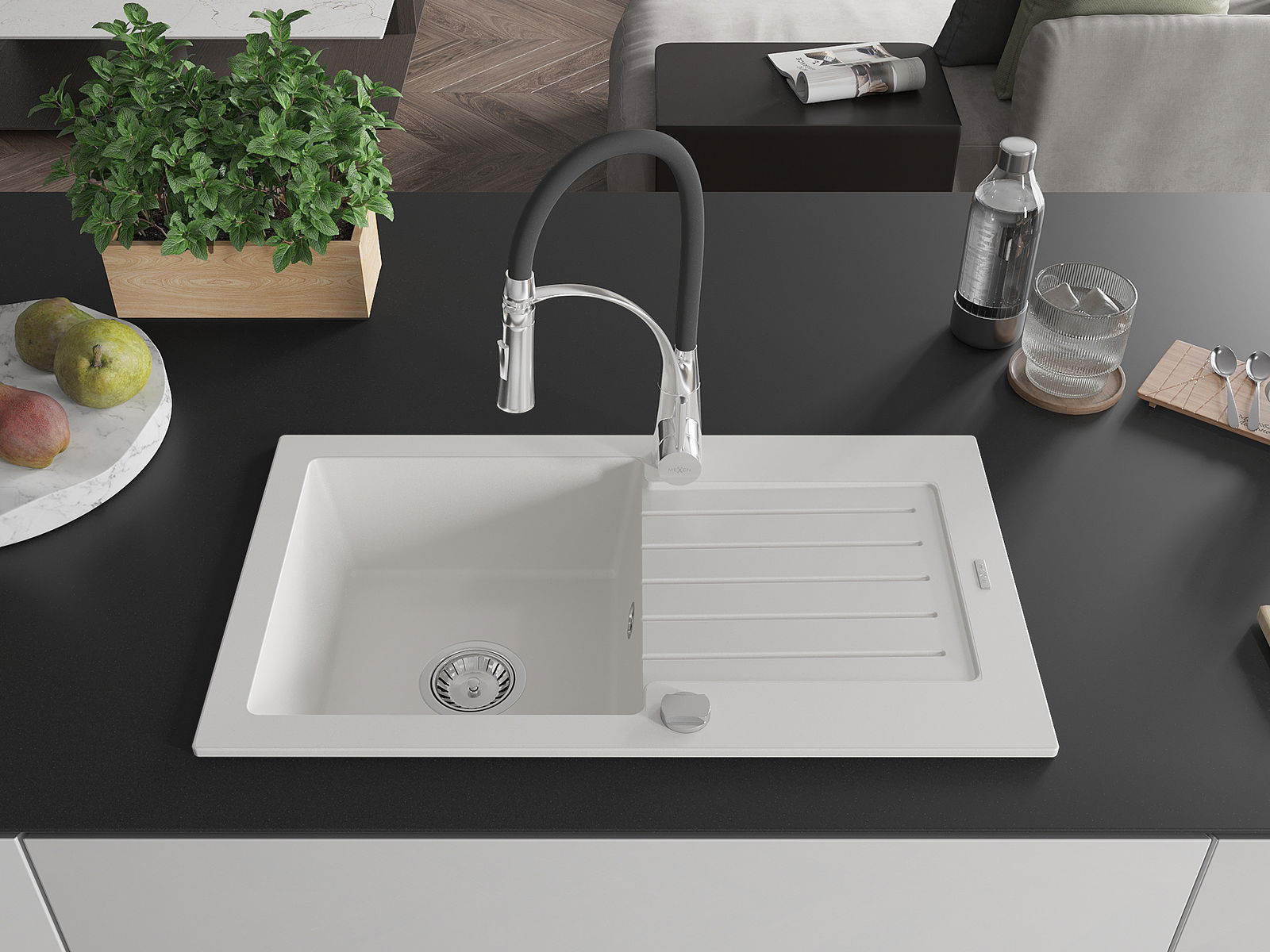 Mexen Pablo chiuvetă de granit cu o singură cuvă și scurgător și baterie de bucătărie Aster, alb - 6510-20-73450-07