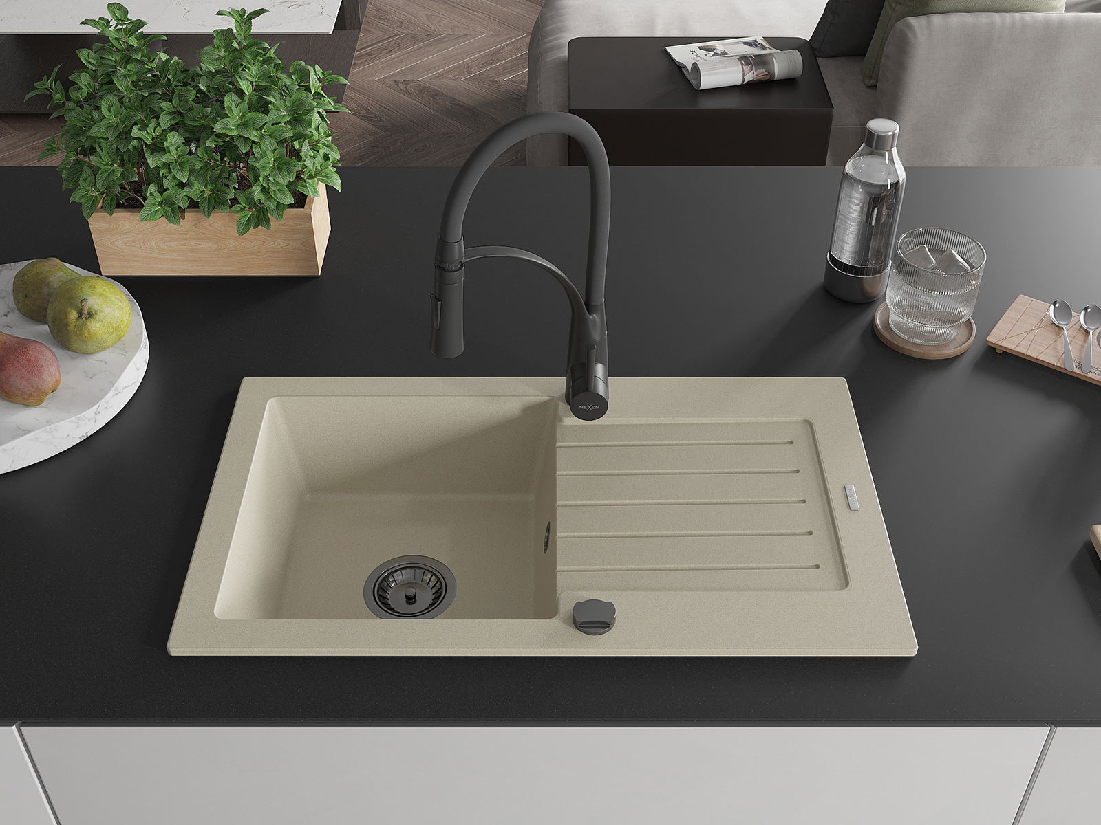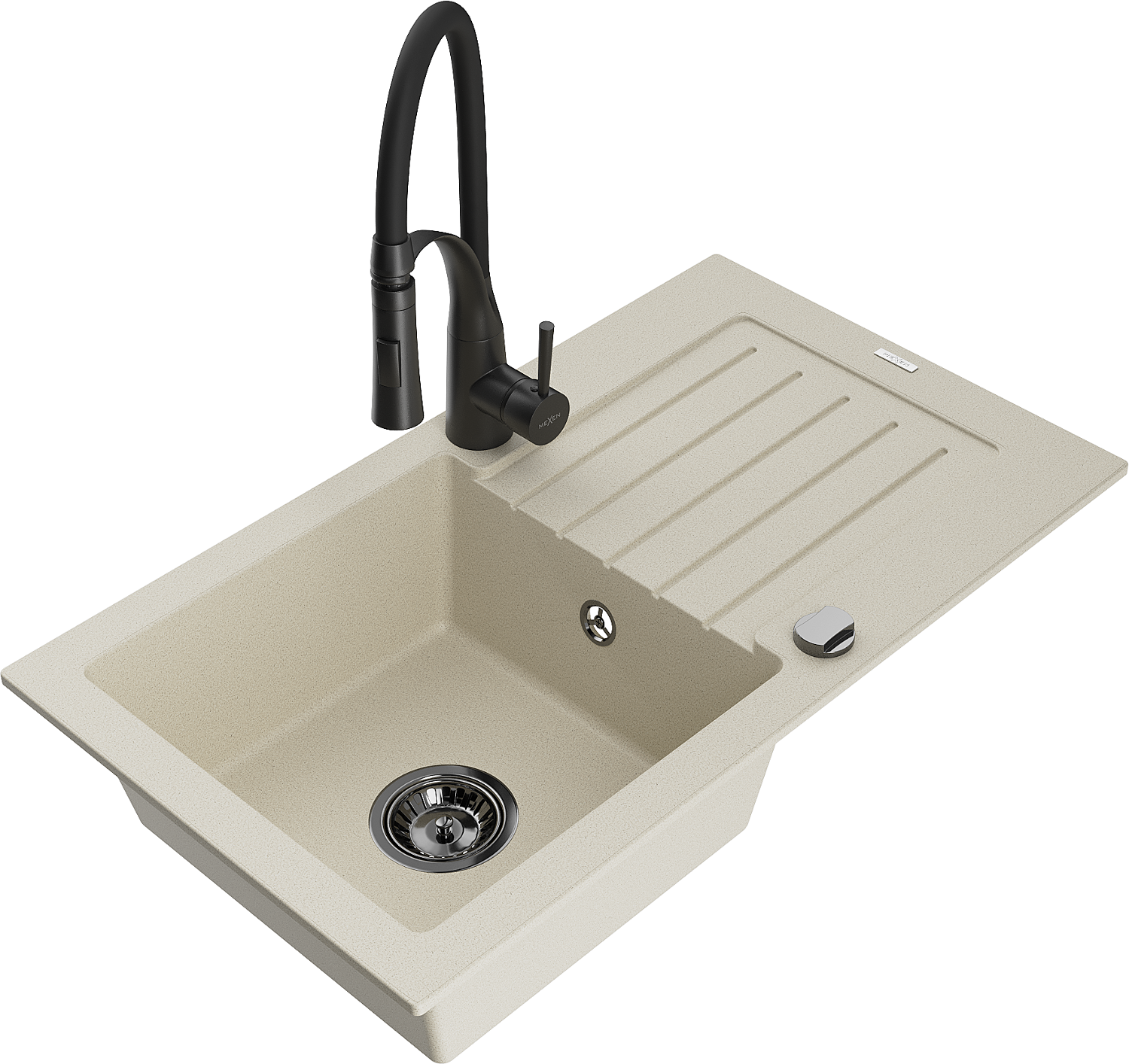 Mexen Pablo chiuvetă de granit cu 1 compartiment cu scurgător și baterie de bucătărie Aster, bej - 6510-69-73450-70-B