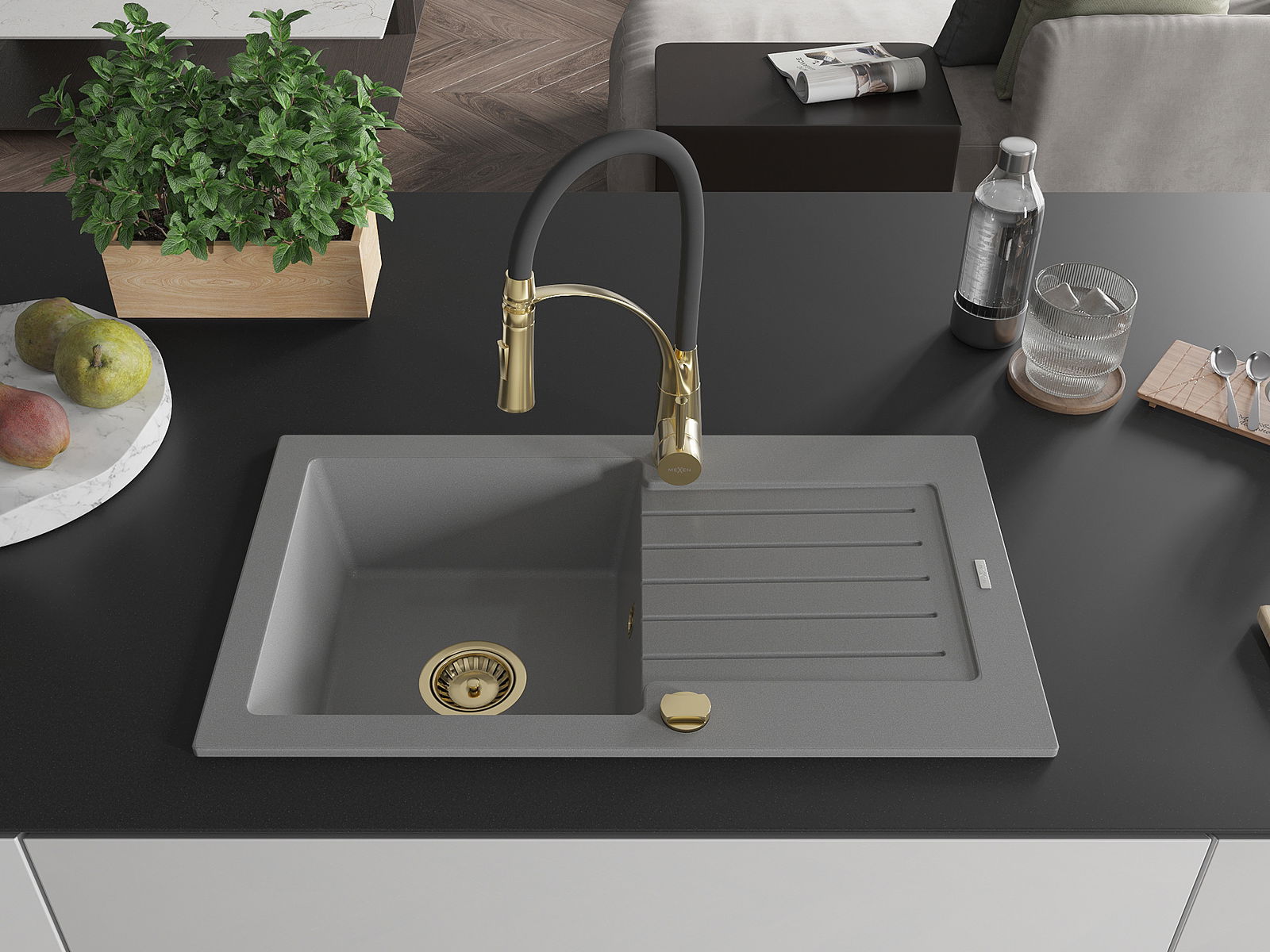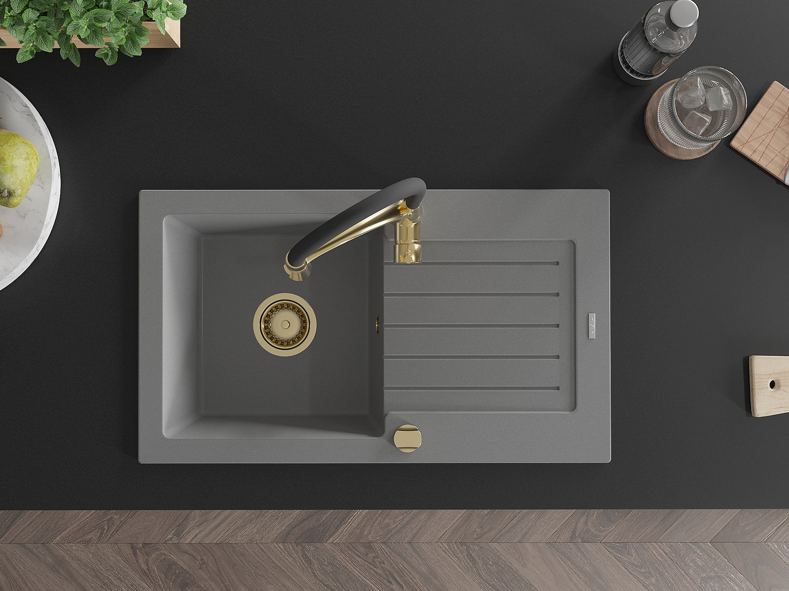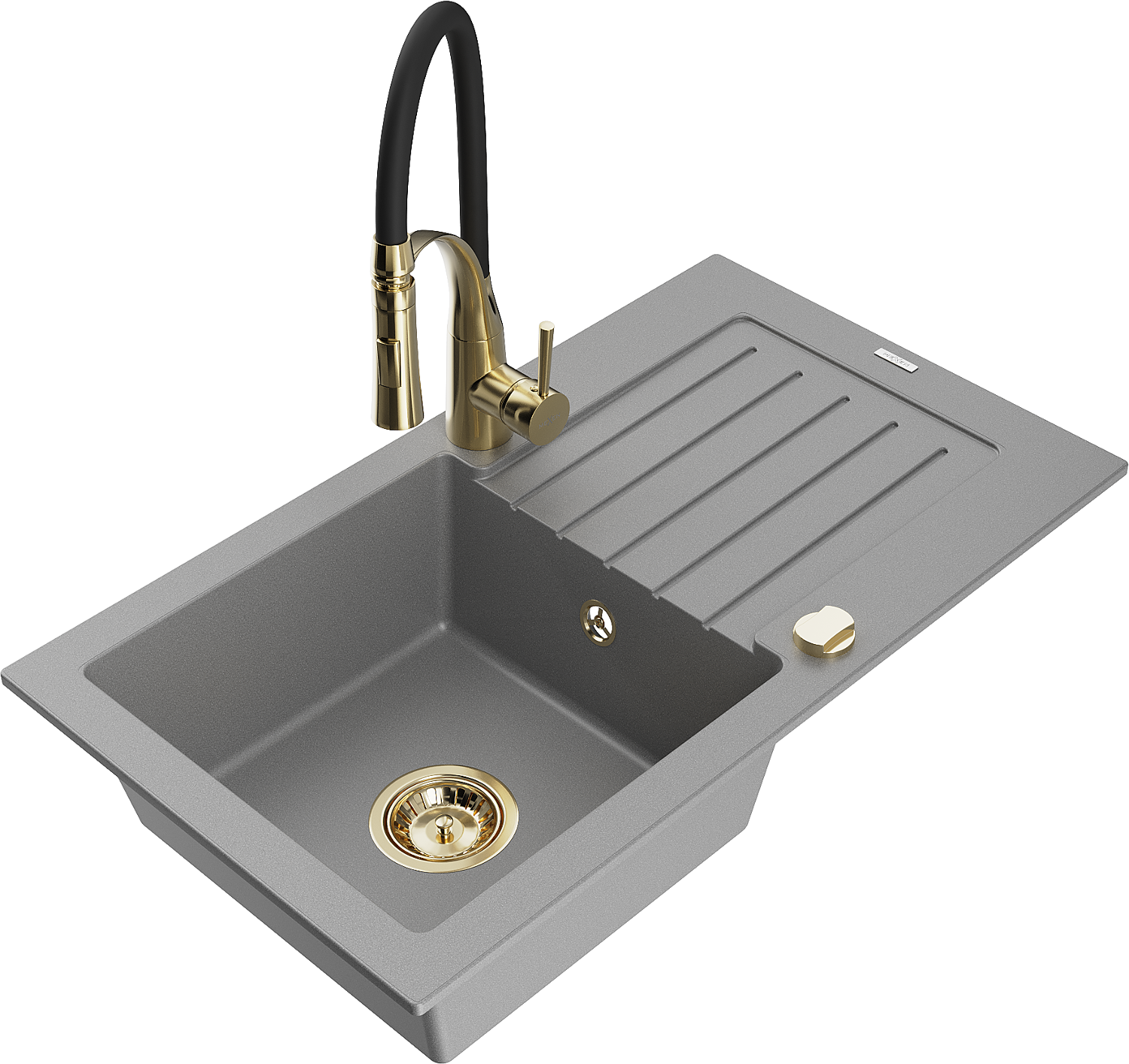 Mexen Pablo chiuvetă de granit cu o cuvă și scurgător, cu baterie de bucătărie Aster, gri - 6510-71-73450-57-G